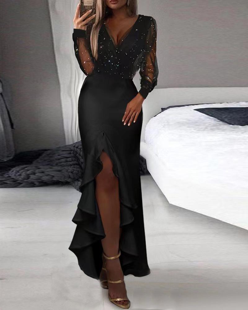 Новое женское платье, сексуальное сетчатое платье с длинными рукавами и пайетками, облегающее платье-юбка