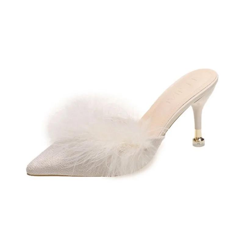 Зимние женские тапочки, теплые сандалии, повседневные туфли на среднем каблуке, новые остроносые плюшевые туфли, размер плюс 42