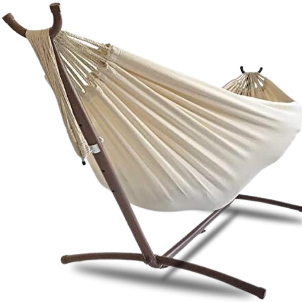 Подвесной гамак Susabi Двуспальный с подставкой Экрю x Коричневая подставка Отдельно стоящий Для помещений Двуспальный гамак Аутентичный Сделано в Колумбии (Набор фонариков)