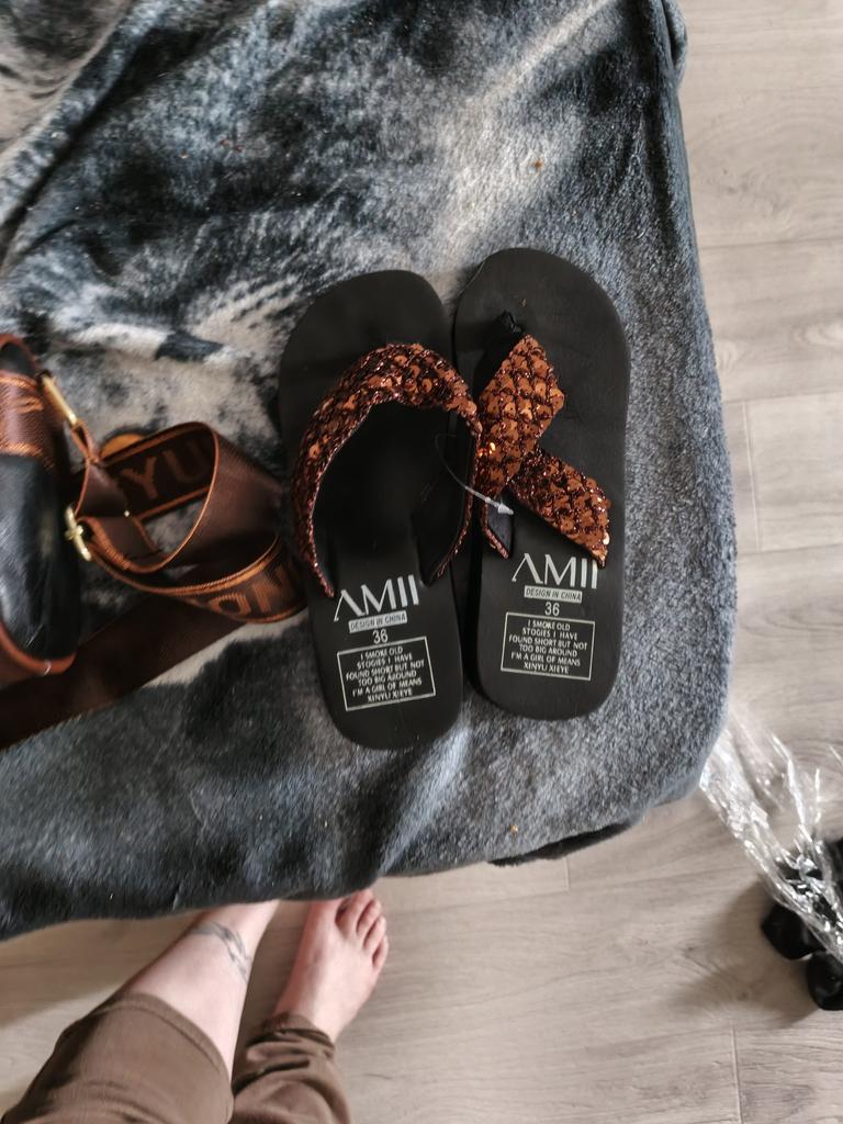 Воняют так, что даже глаза заслезились, выставила в террасу, надеюсь выветрится. Сами шлепки на вид симпатичные, пошиты аккуратно, только подошва пластиковая, как пупсы голыши были в советском союзе. В подъёме нормально, а вот в пальцах немного узкие, но думаю это хорошо, нога не будет проскальзывать. Посмотрим на сколько хватит в носке. Пришли в пакете, размер указан только на пакете, на самих тапках нигде не нашла.