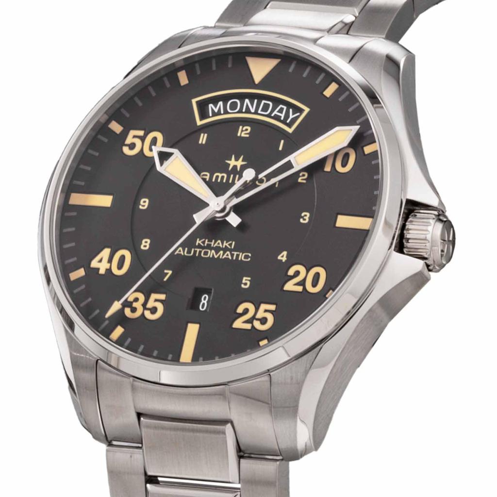 Часы Khaki Aviation Pilot Day Date Auto Khaki Aviation Черный циферблат Нержавеющая сталь Сапфировое стекло Автоматические 42 мм Швейцарские брендовые часы H64645131 Серебряные