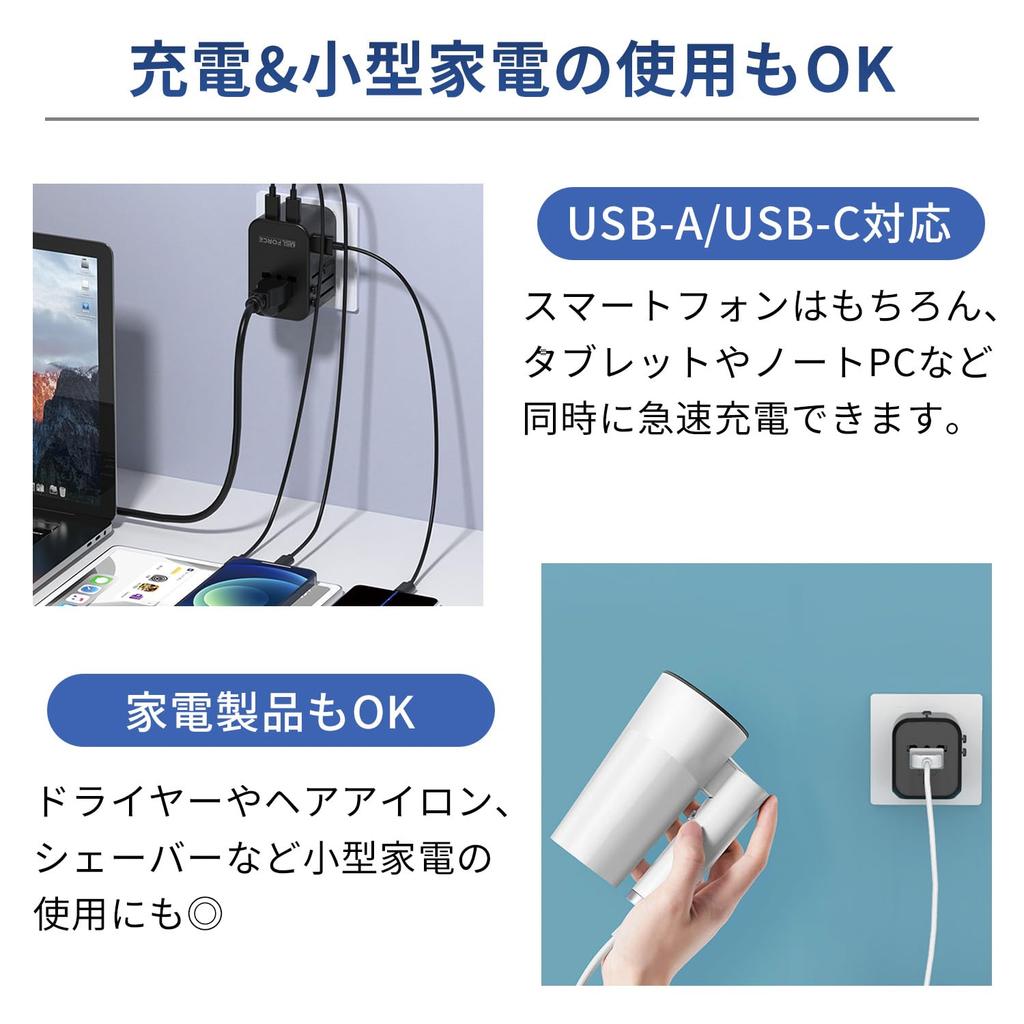[Быстрая зарядка и использование мелкой бытовой техники] Совместимость с USB-A/USB-C, поэтому вы можете быстро заряжать смартфоны, планшеты, ноутбуки и т. д.. в то же время. Высокое напряжение с максимальной выходной мощностью 2000 Вт позволяет стабильно использовать небольшие бытовые приборы, такие как фены, утюжки для волос и бритвы.