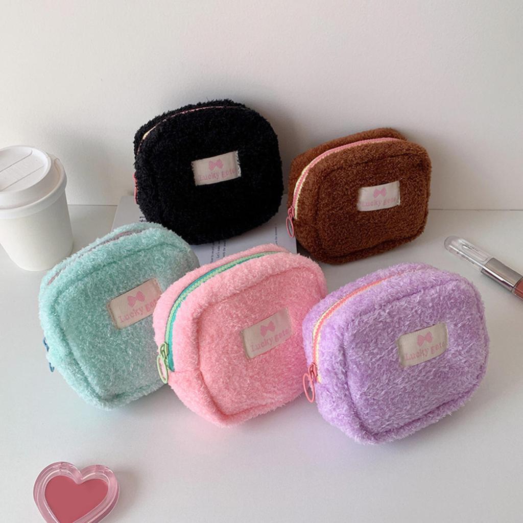 Однотонный плюшевый мини-кошелек для монет, милый кошелек для девочек, косметичка, помада, квадратные сумки-клатчи на молнии, портативный чехол для наушников