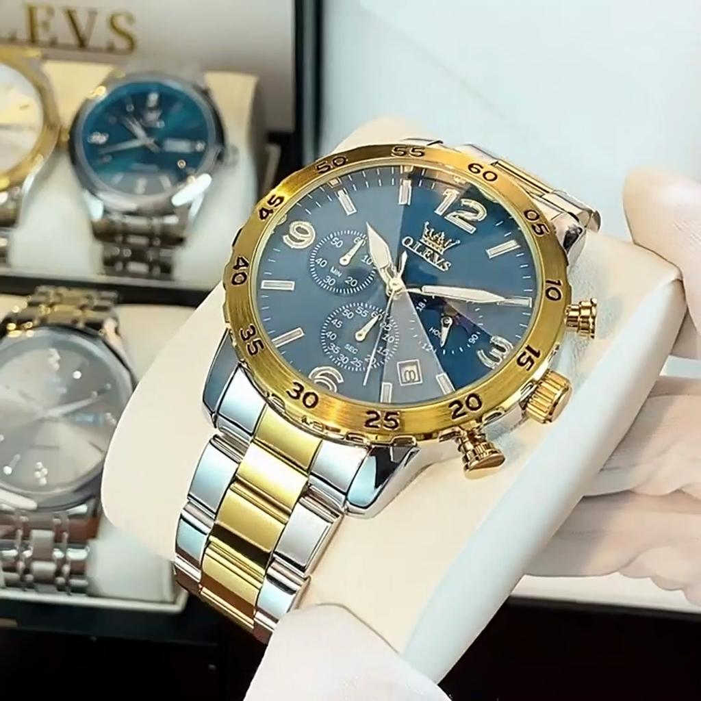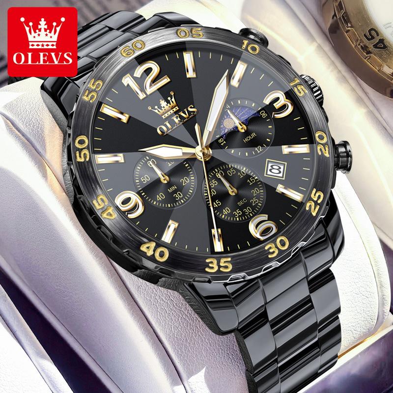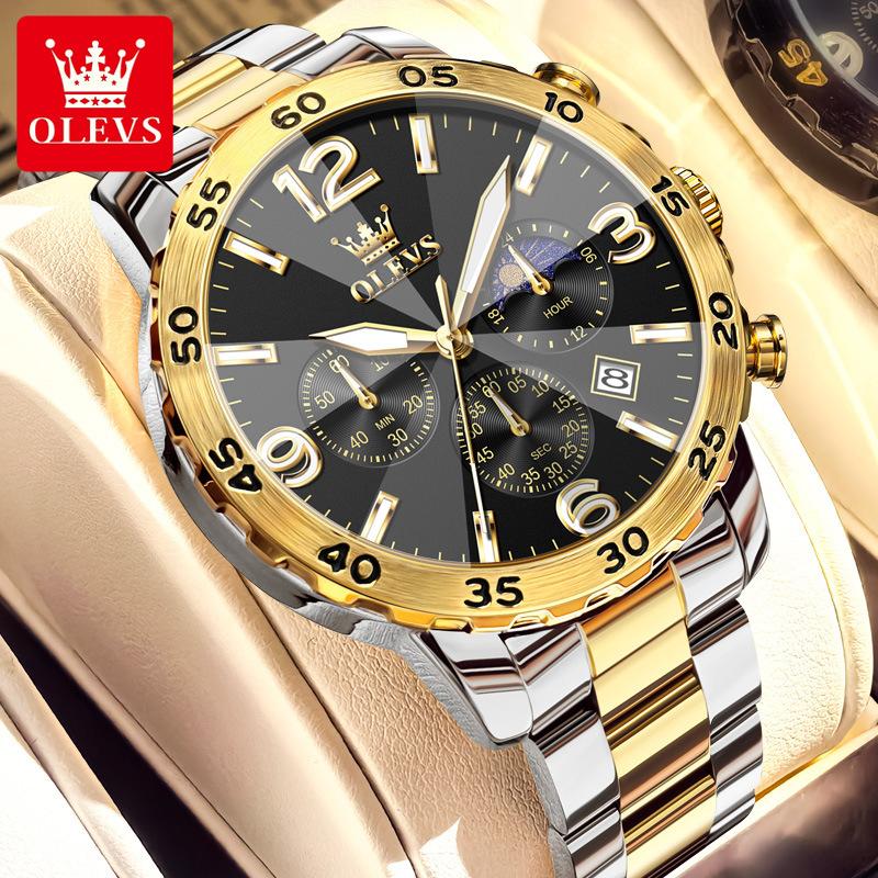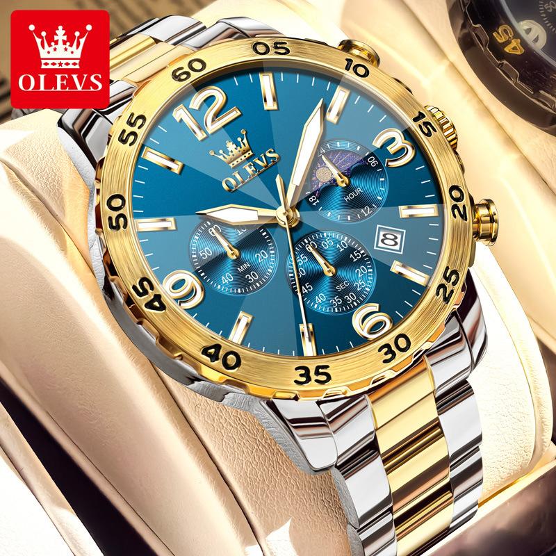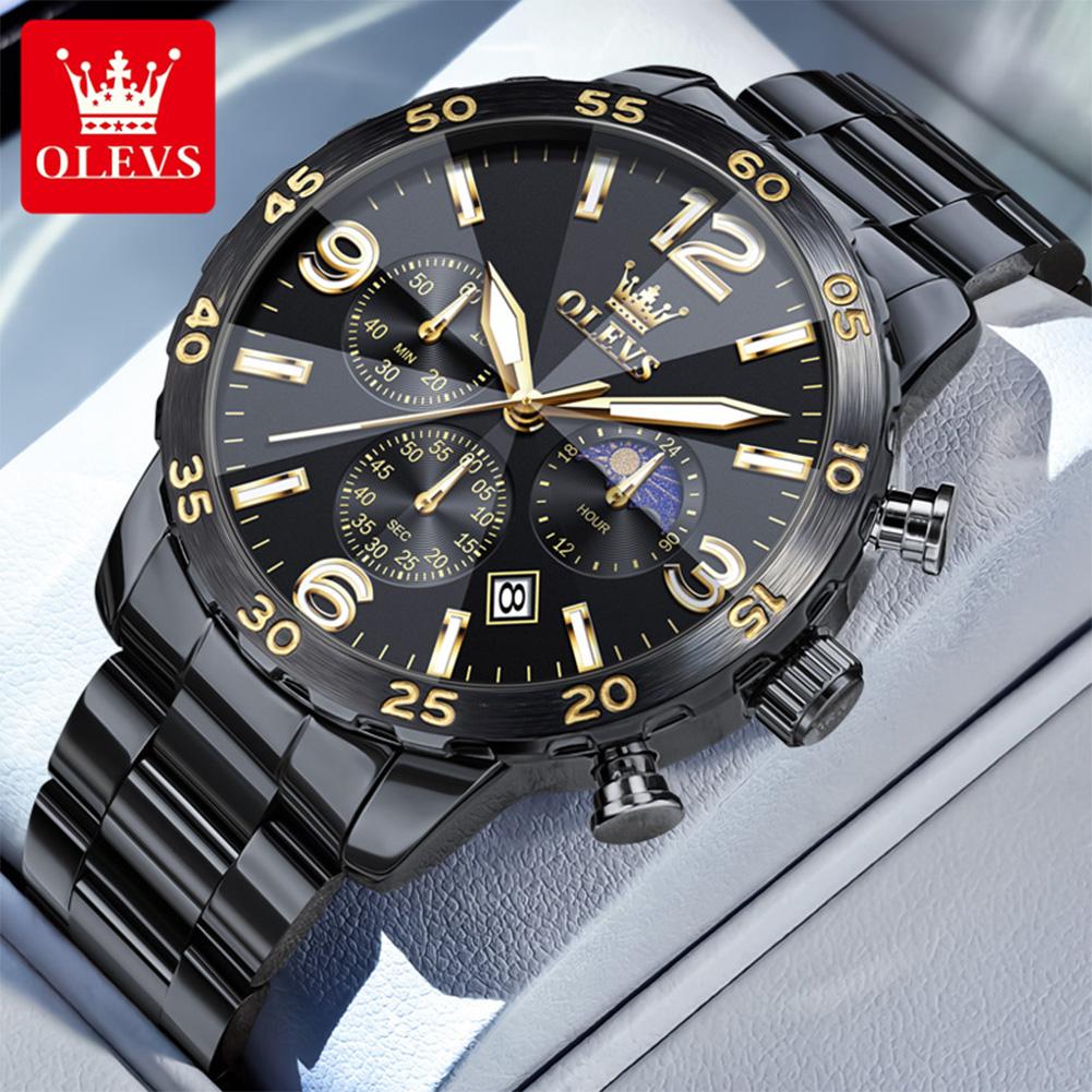 OLEVS Мужские часы класса люкс, кварцевые часы, многофункциональные водонепроницаемые, с фазой Луны, хронограф, оригинальные мужские наручные часы