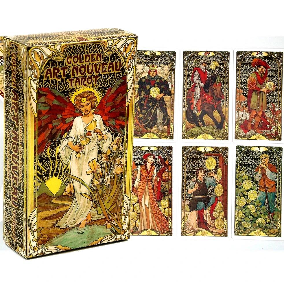 Золотая колода карт Таро в стиле ар-нуво с картами-путеводителями. Наборы книг по оккультному гаданию для начинающих. Классика.
