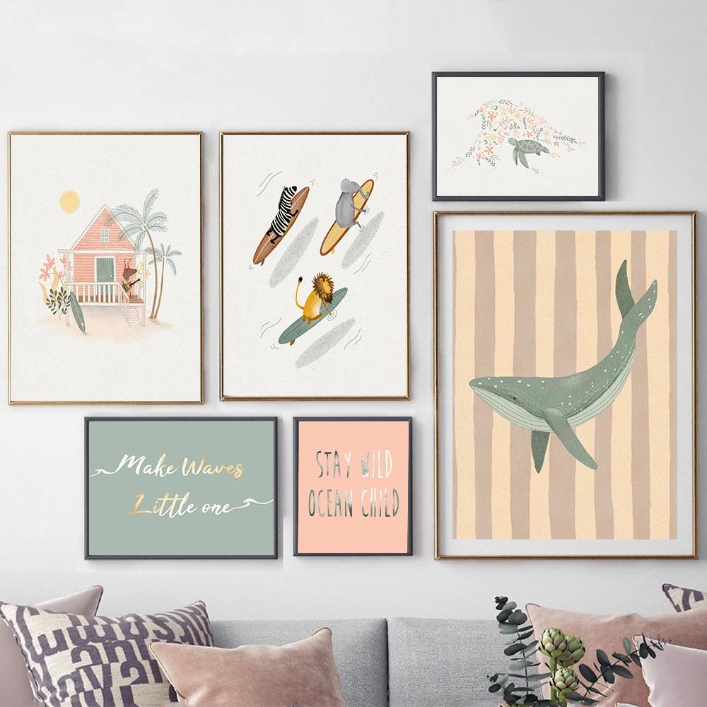 Галерея для девочек Детская Картина Кит Пляж Серфинг Печать на холсте Серфинг Животные Тигр Слон Зебра Настенное искусство Плакат Картины Декор