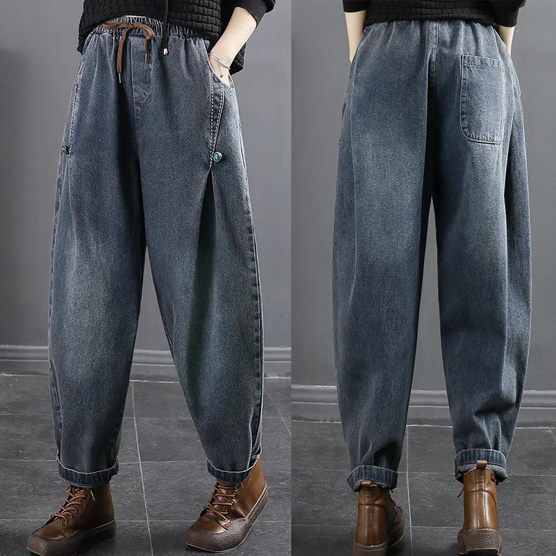 Женские ретро-джинсовые шаровары с эластичной талией, свободные широкие прямые джинсовые брюки с большими карманами