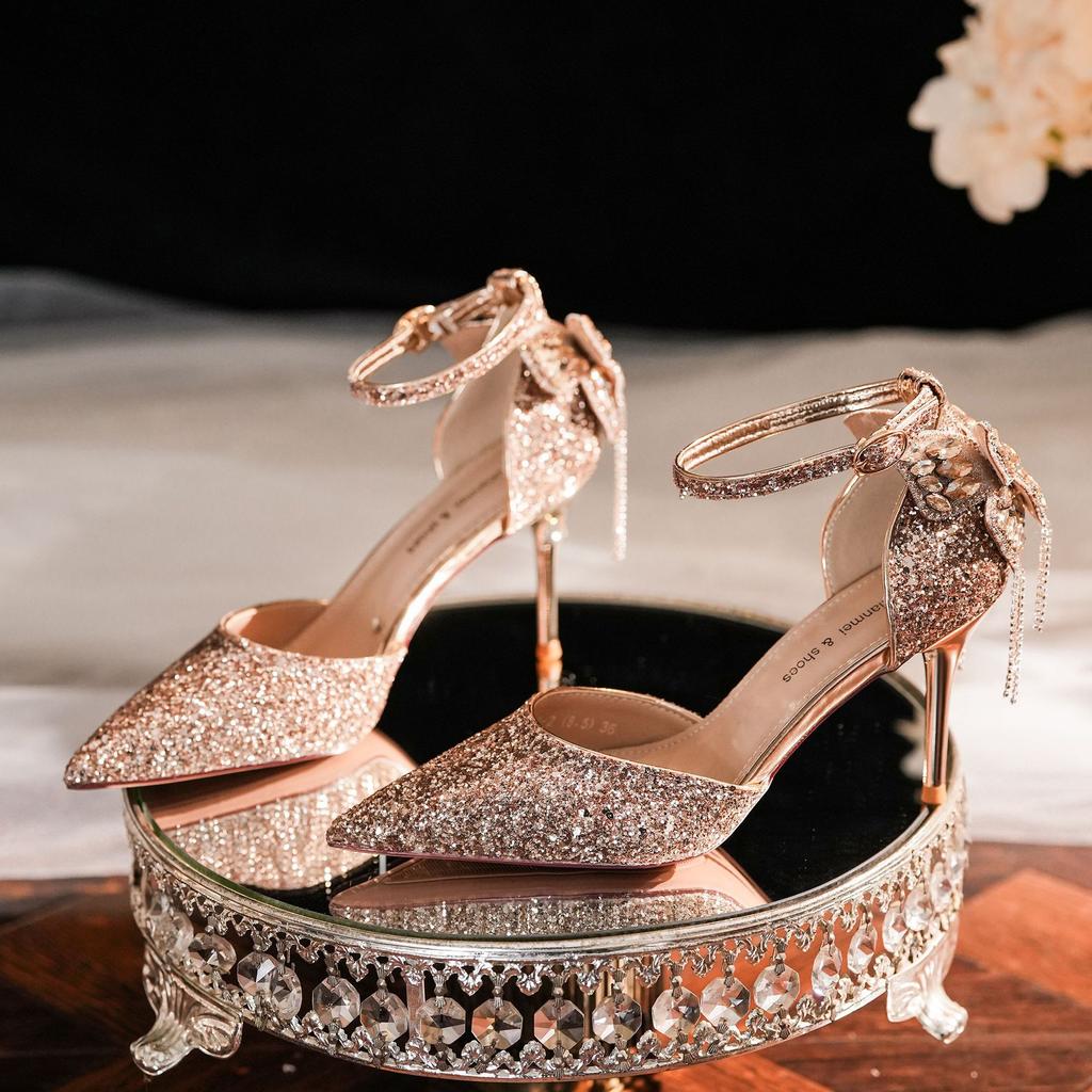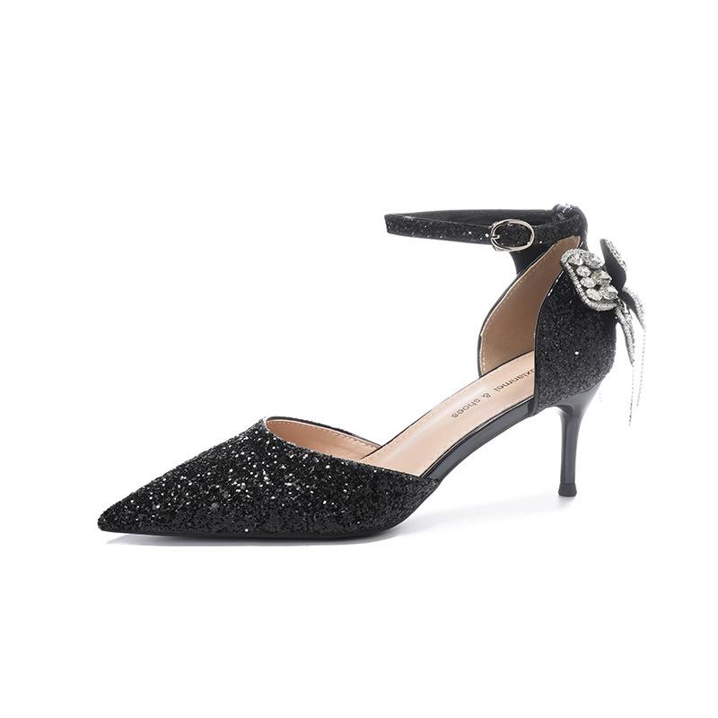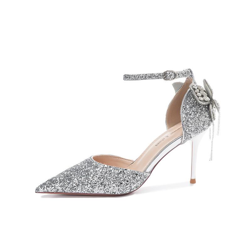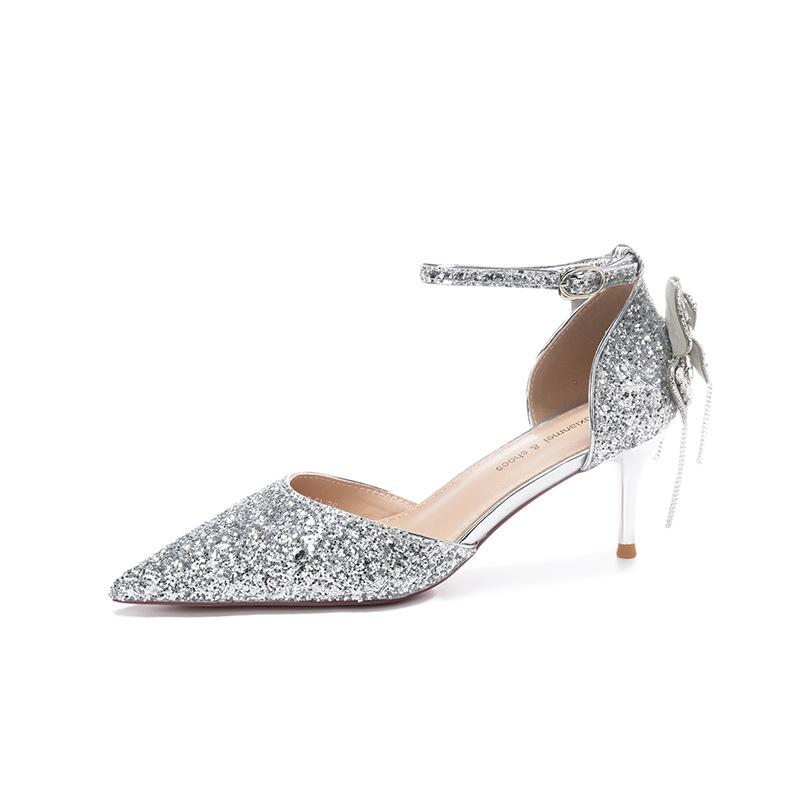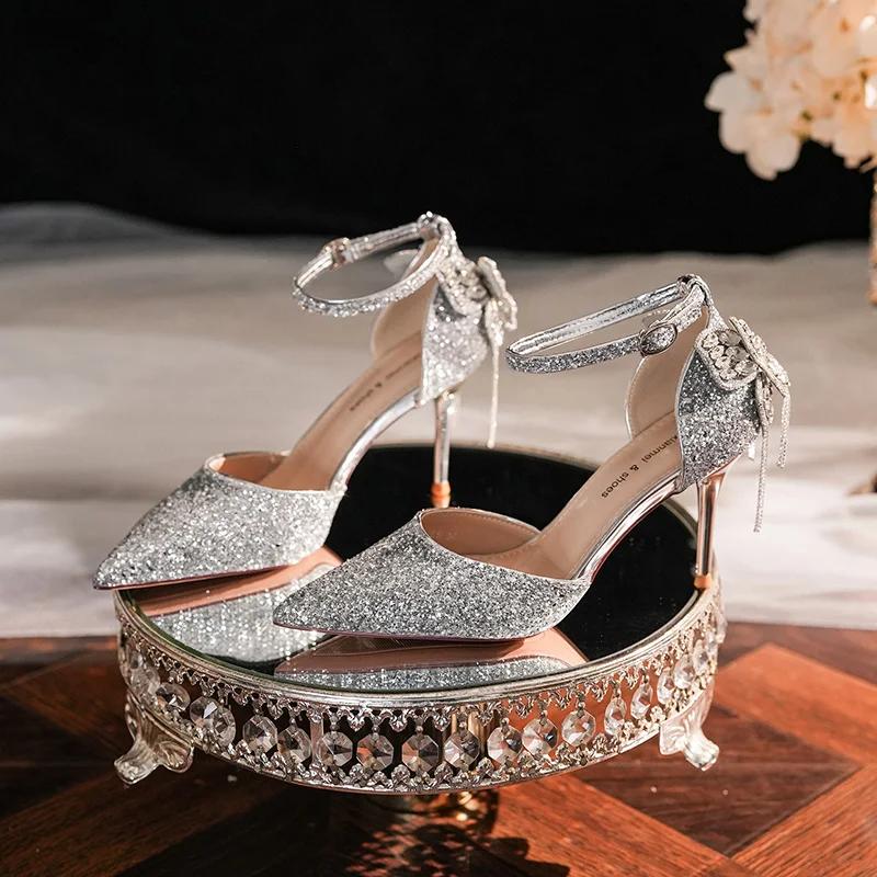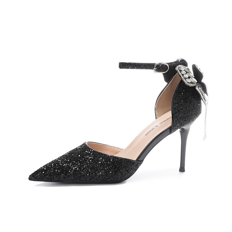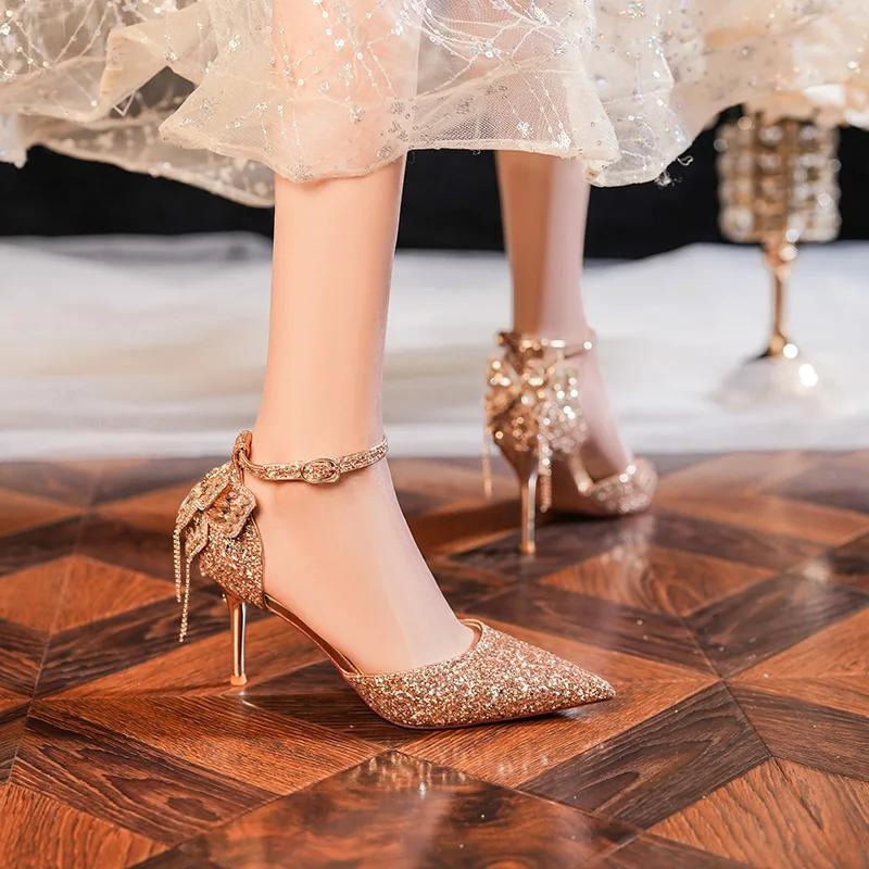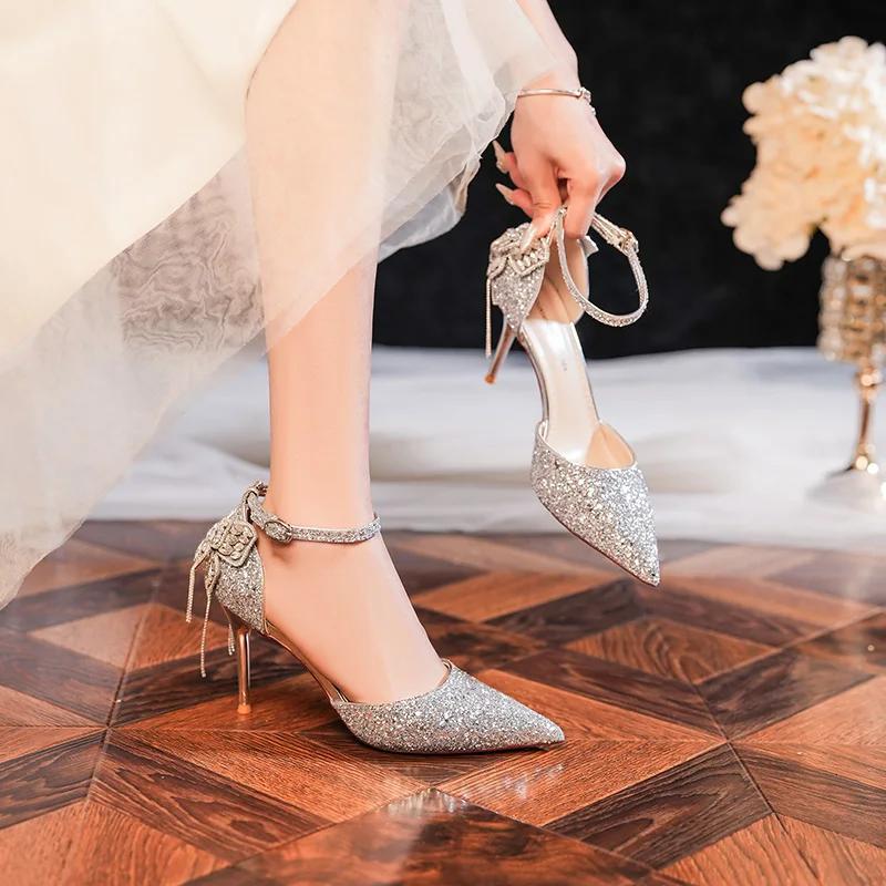 Летние женские туфли-лодочки Роскошные остроносые босоножки на высоком каблуке со стразами, бантом, цепочкой и пайетками Банкетное платье Свадебные туфли на высоком каблуке