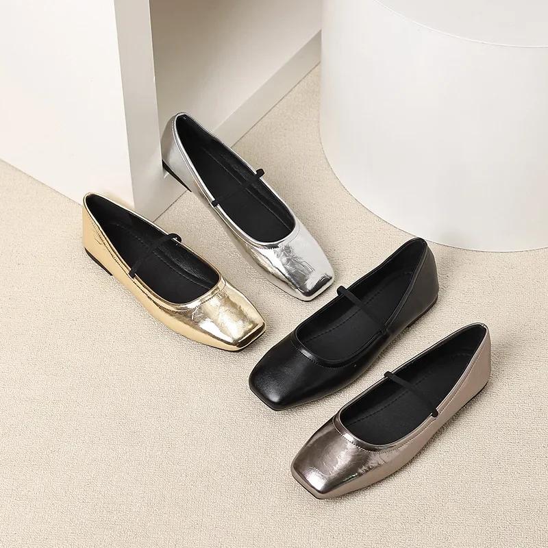 Женские туфли Мэри Джейн на мягкой подошве, женские туфли-лоферы с квадратным носком, серебристо-золотые, элегантные балетки без застежек