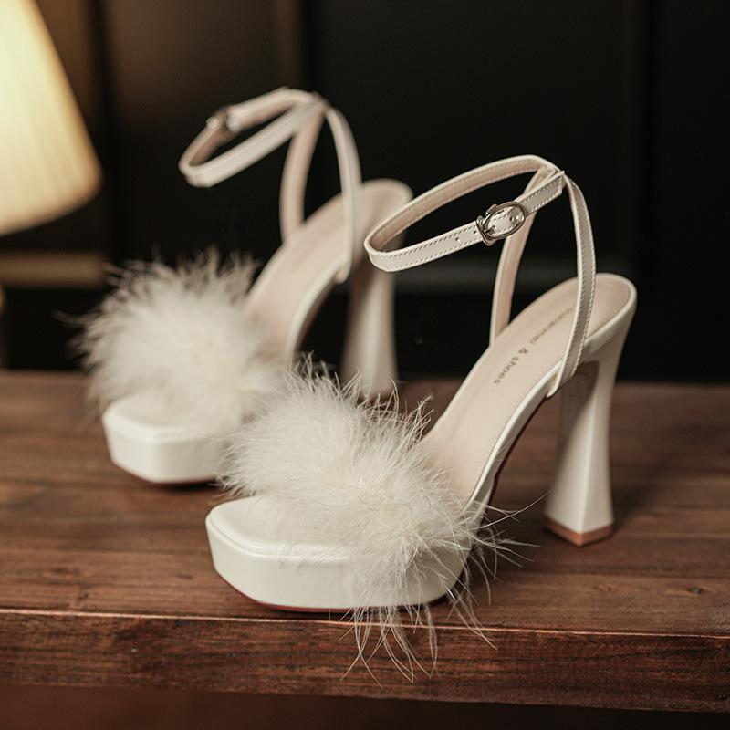 Летние Модные Туфли-Лодочки Сексуальные Квадратный Носок Пряжка для Волос Абрикосовые Черные Массивный Каблук Высокий Каблук Сандалии Женские Вечерние Свадебные Туфли