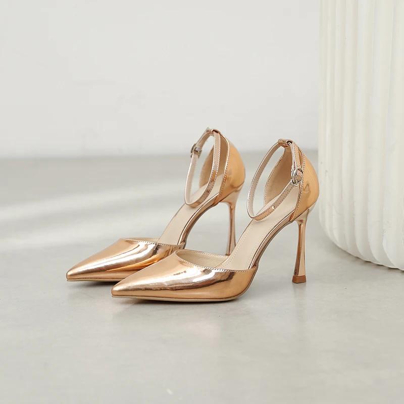 Летние роскошные сексуальные женские босоножки с острым носком из лакированной кожи с пряжкой на высоком каблуке, золотистые туфли для вечеринки и свадьбы, большие размеры