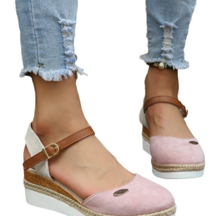 Женские легкие босоножки на покатом каблуке больших размеров с цветными блоками, сандалии с пряжкой и круглым носком с толстой подошвой