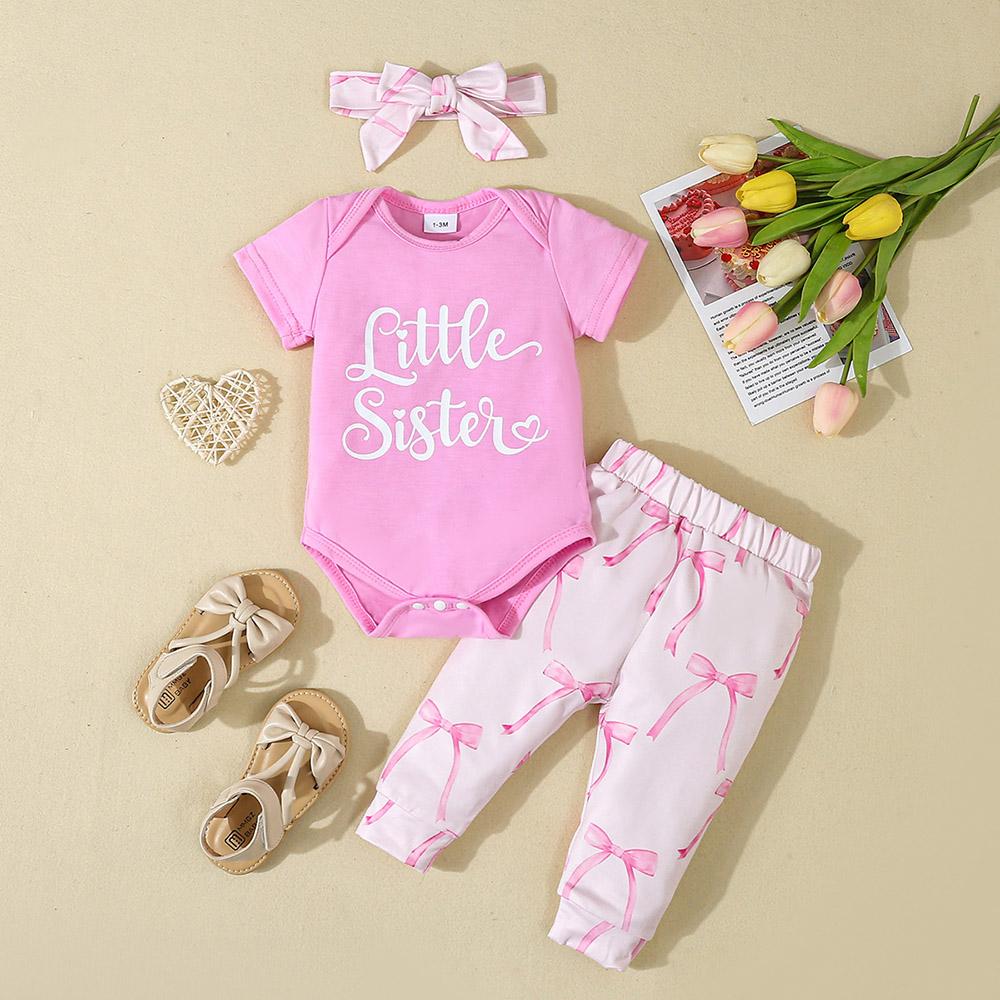 1-18 месяцев Девочка комбинезон с короткими рукавами и монограммой с бантом напечатанные брюки и повязка на голову розовый костюм