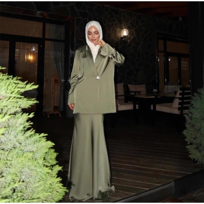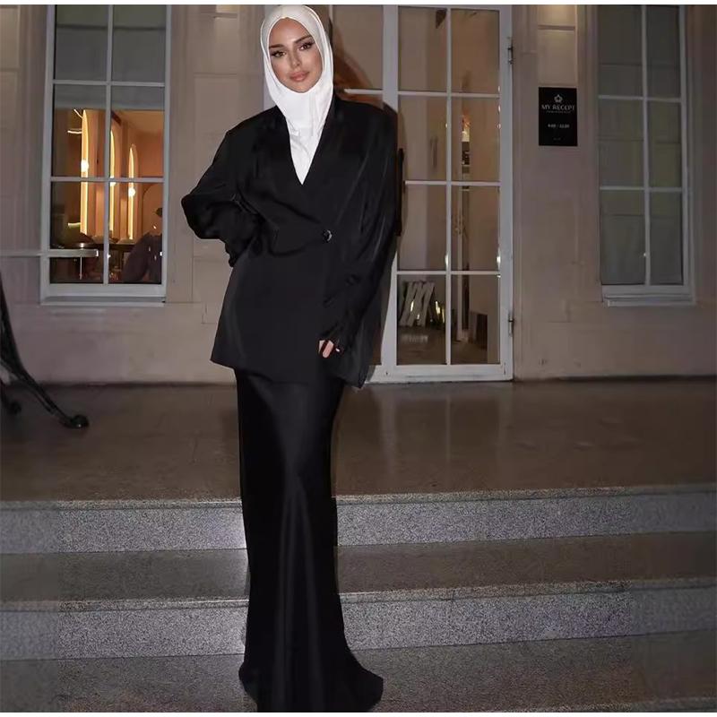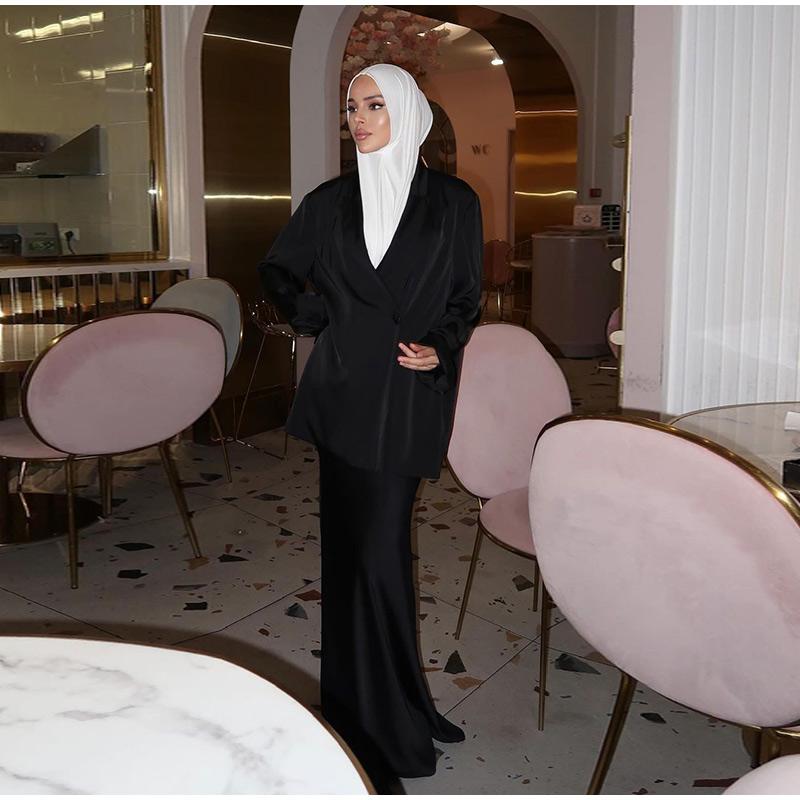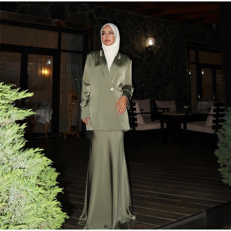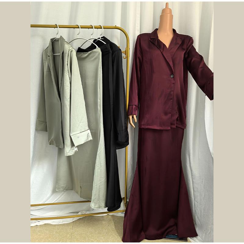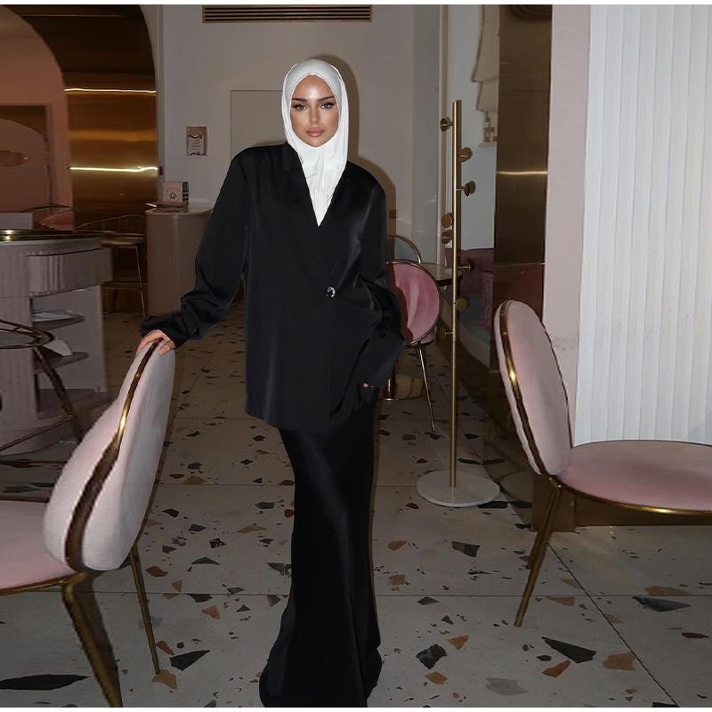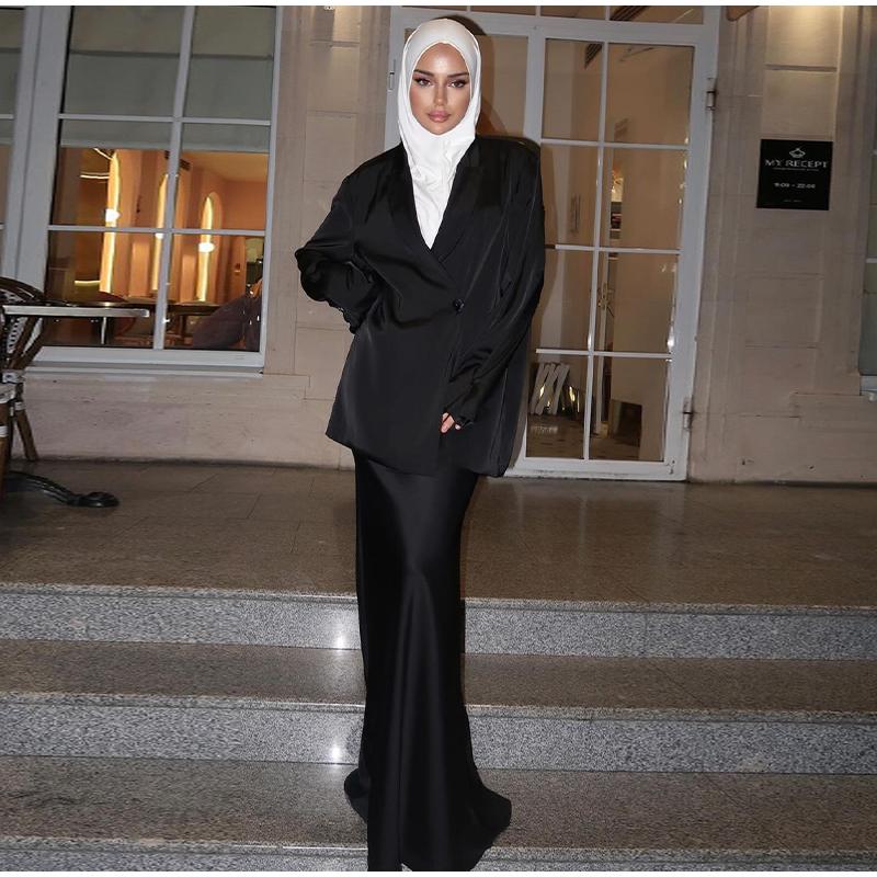 Модные однотонные атласные длинные юбки, женские элегантные рубашки с длинными рукавами и лацканами, юбки-русалки макси, комплекты из 2 предметов, мусульманские наряды