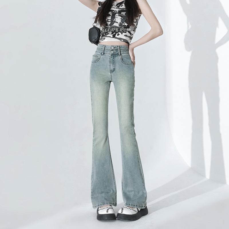 Женские весенние новые зауженные эластичные брюки клеш с высокой посадкой, цвет античный синий, двойная пряжка