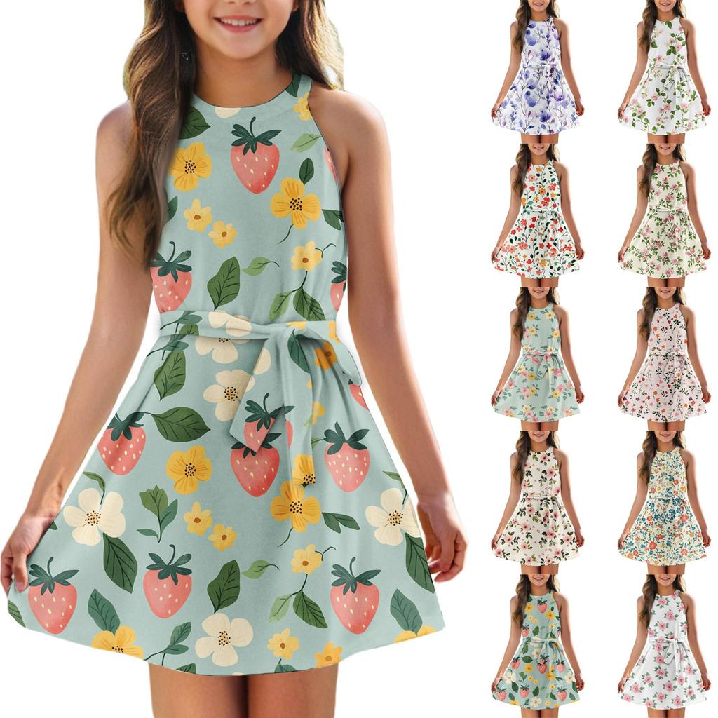 Летнее платье для девочек Платье без рукавов на бретельках Однотонное платье без рукавов с принтом Повседневное платье