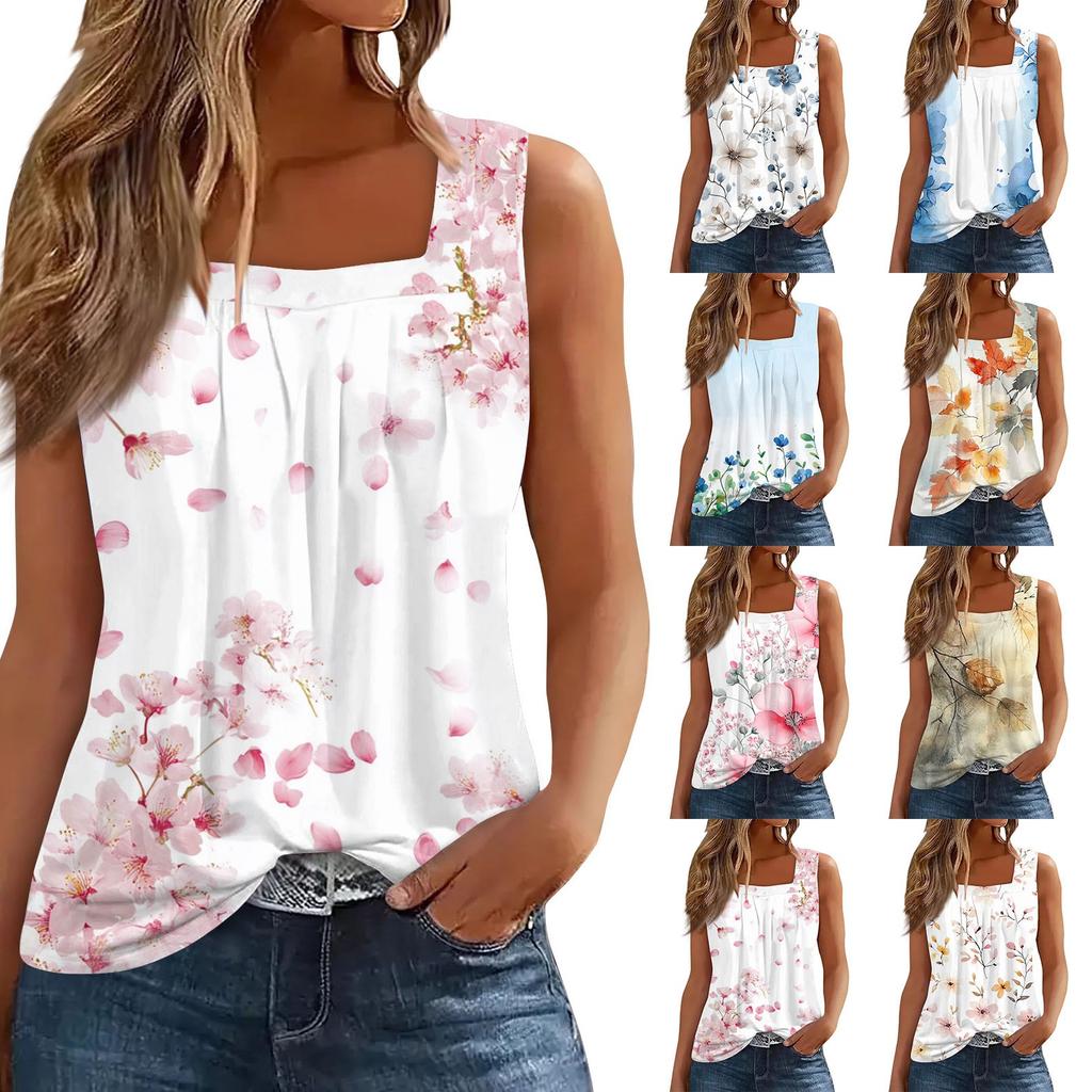 Женская плиссированная футболка без рукавов с квадратным воротником и принтом — купить товар онлайн с бесплатной доставкой до всему миру!