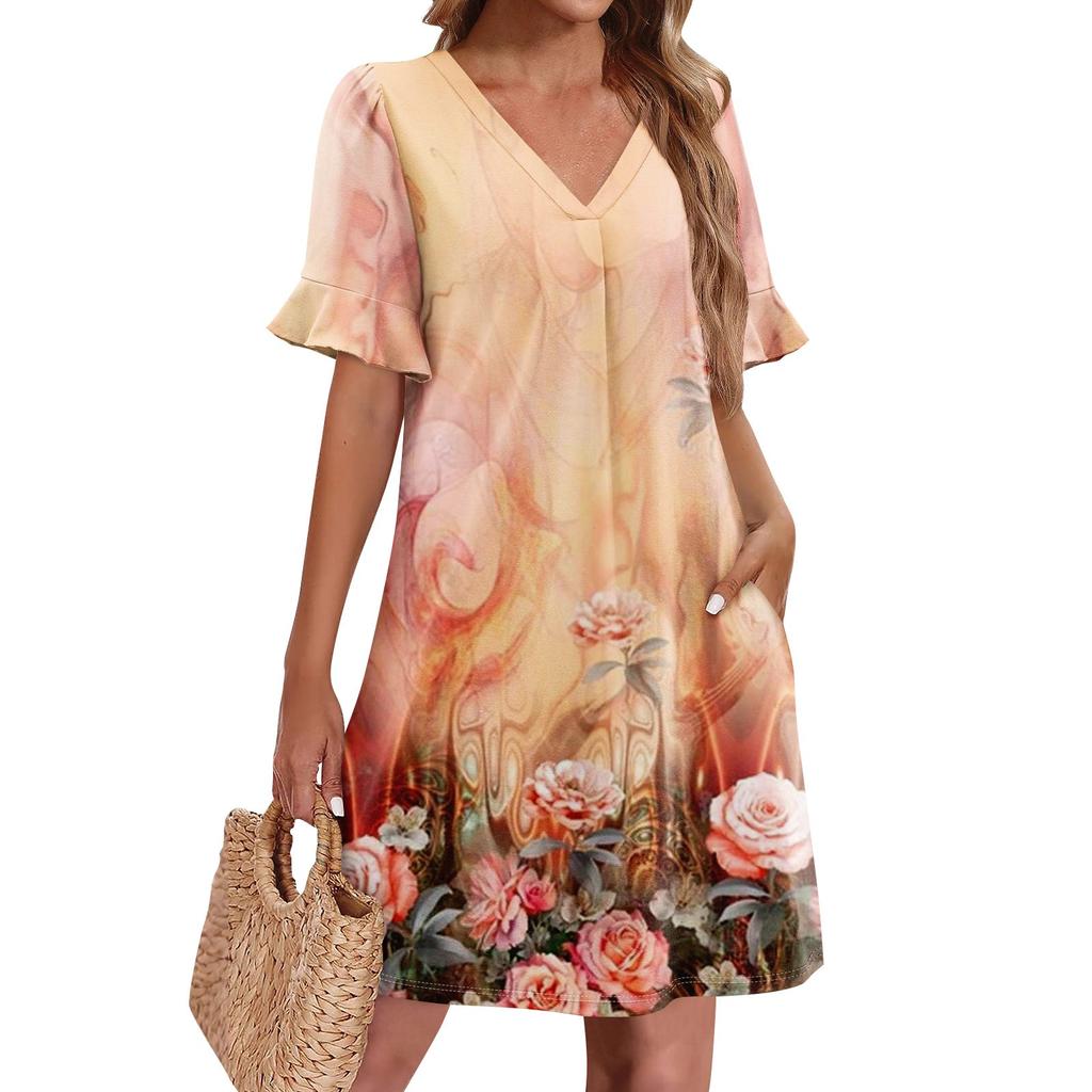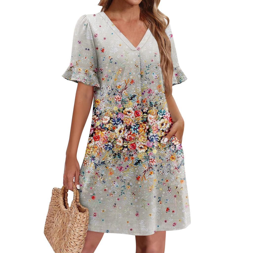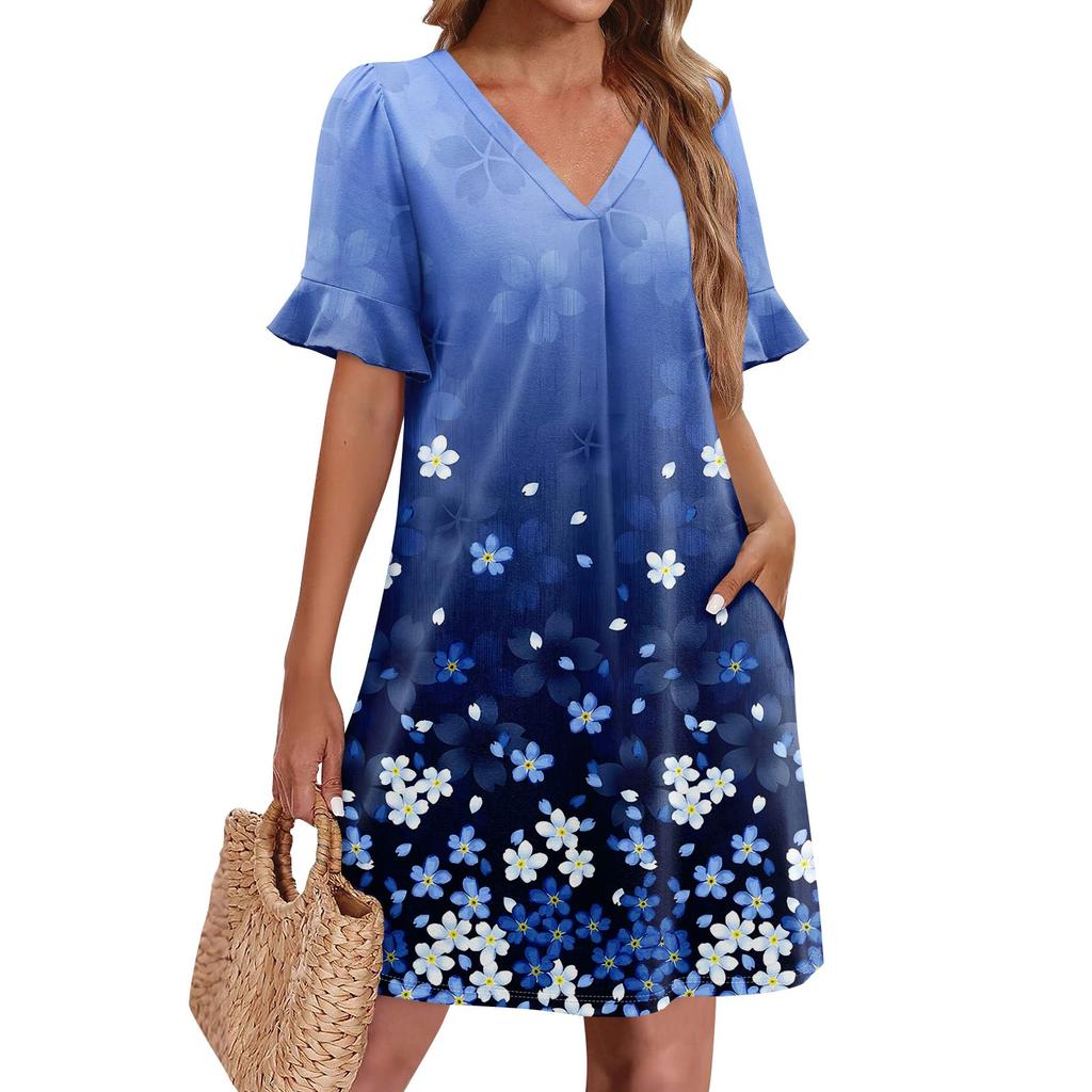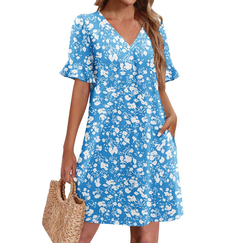 Летние платья для женщин с V-образным вырезом, оборками и коротким рукавом, повседневное свободное платье с принтом, пляжное платье с карманами