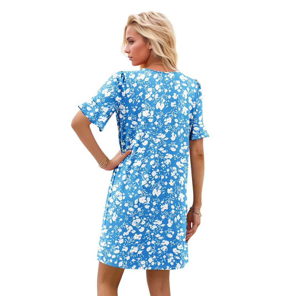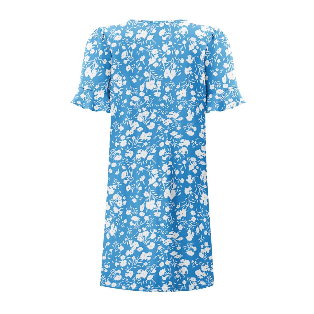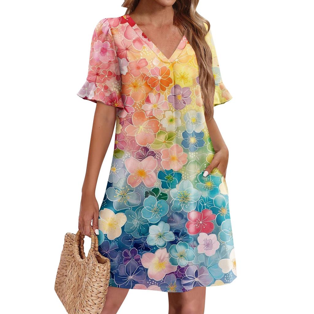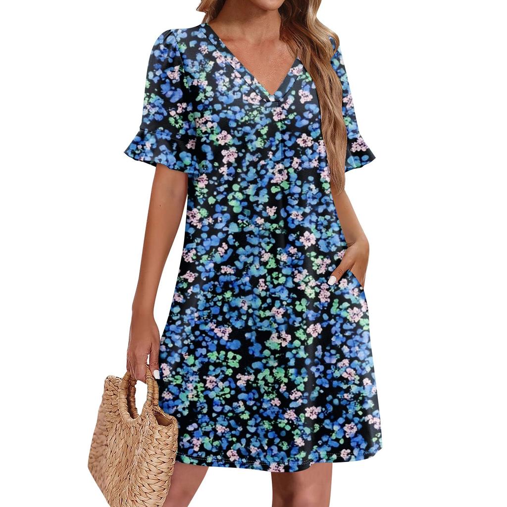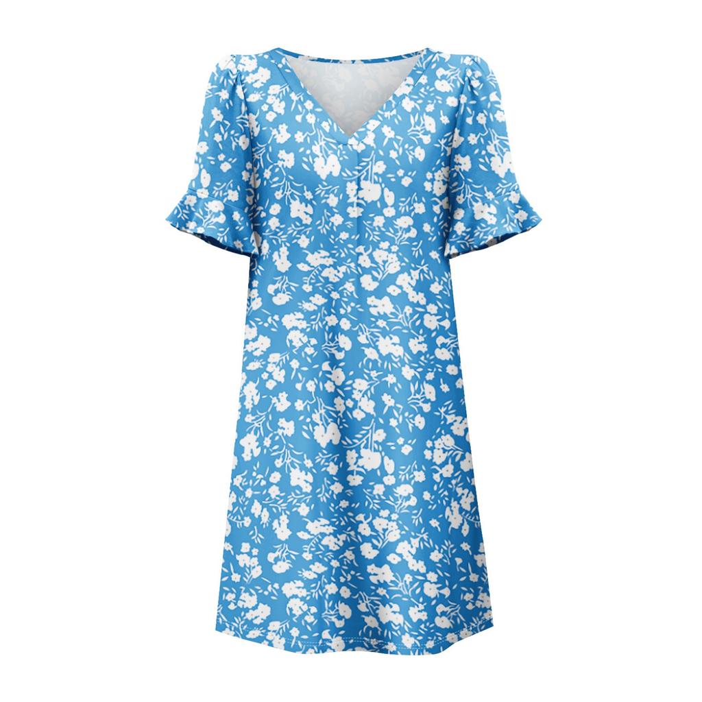 Летние платья для женщин с V-образным вырезом, оборками и коротким рукавом, повседневное свободное платье с принтом, пляжное платье с карманами