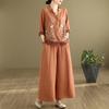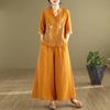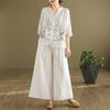 Женский летний комплект в стиле ретро с литературным стилем, вышитый топ со стоячим воротником и широкие брюки, комплект из двух предметов