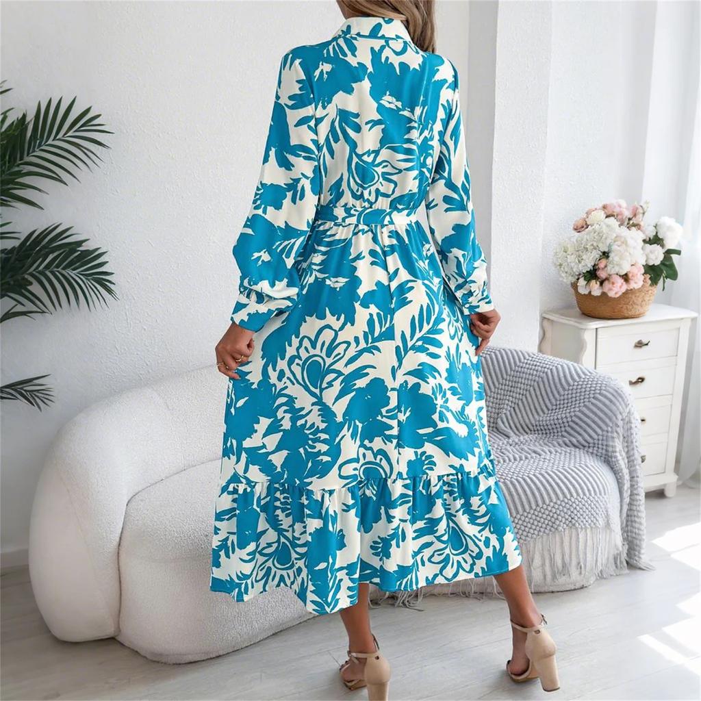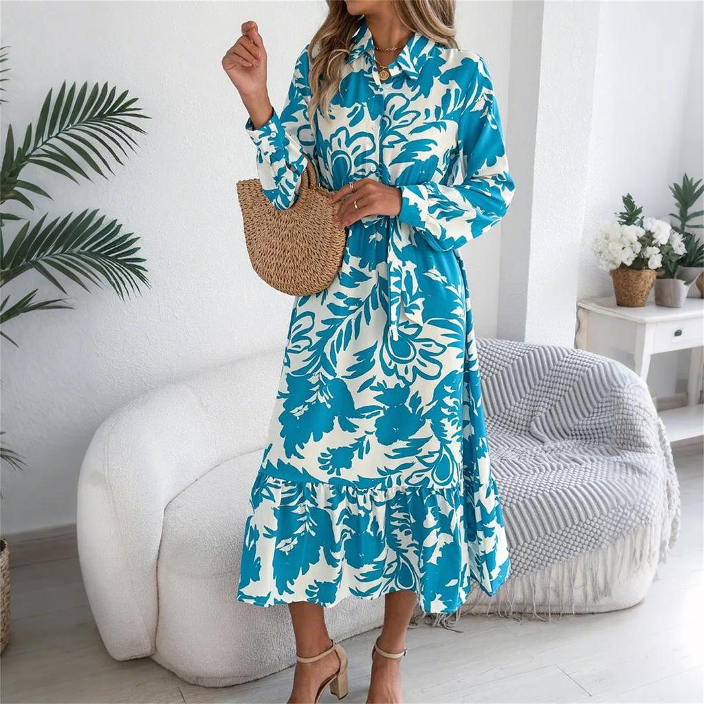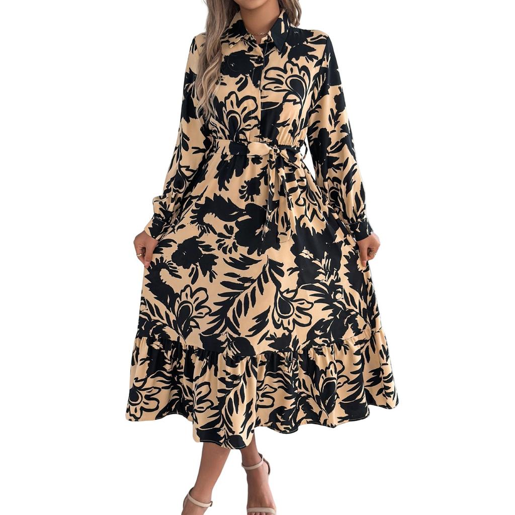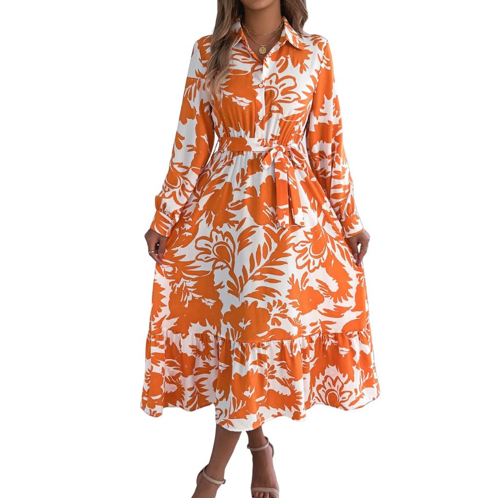 Женское модное платье-рубашка с цветочным принтом и лацканами, с длинным рукавом и завышенной талией