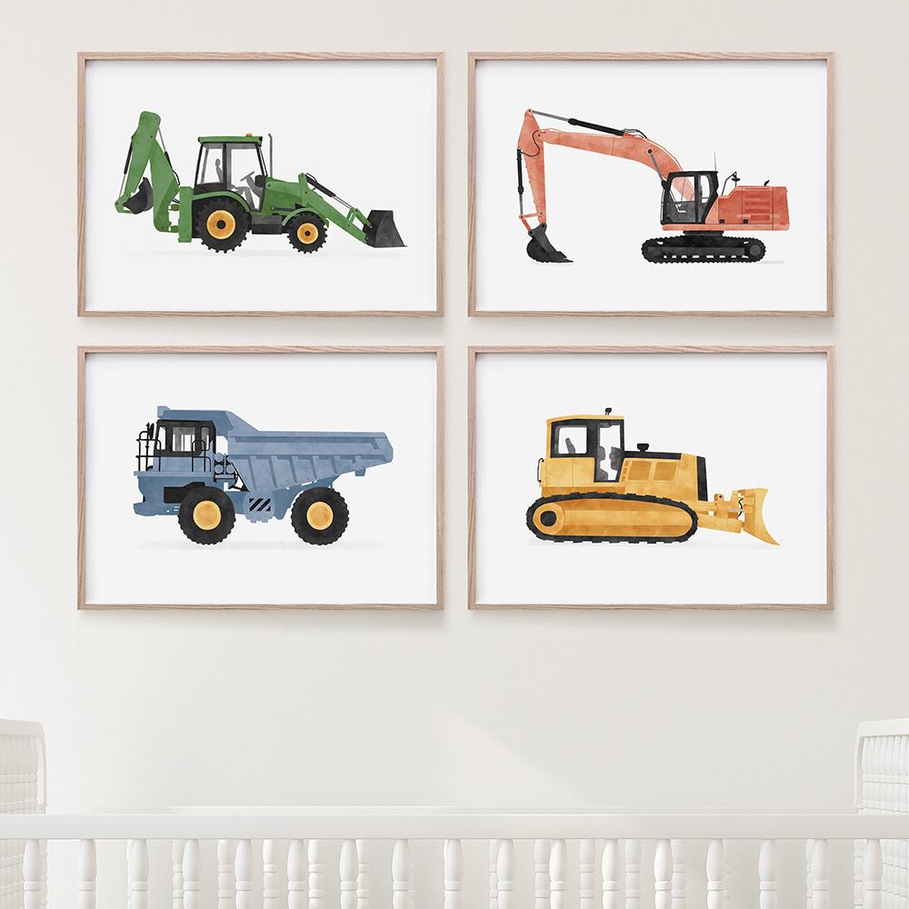 Construction Vehicles Watercolor Art Canvas Painting Kids Room Decor Dump Truck Digger Bulldozer Posters and Prints Boys Gift No Frame