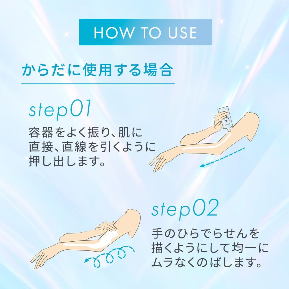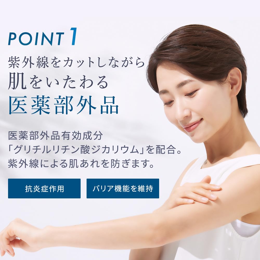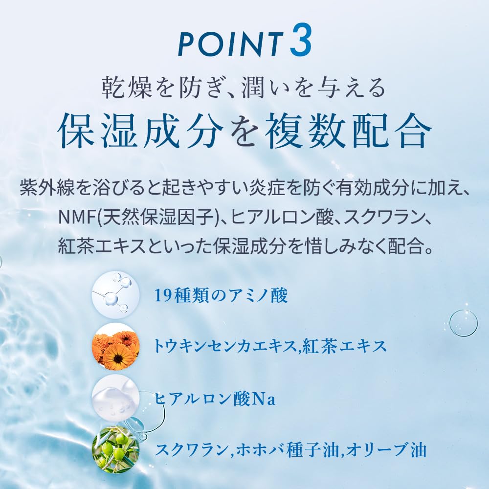 [Солнцезащитная эмульсия для всего тела, которая легко наносится и обеспечивает комфортную защиту] Содержит активные ингредиенты*1, которые предотвращают воспаления, которые могут возникнуть при воздействии УФ-лучей, а также ряд увлажняющих ингредиентов. Несмотря на то, что это нехимическая разработка, она достигла самой высокой степени защиты от ультрафиолета в Японии*2. Гладкая текстура быстро распределяется по всем участкам кожи и плотно прилегает, защищая ее от ультрафиолетовых лучей.