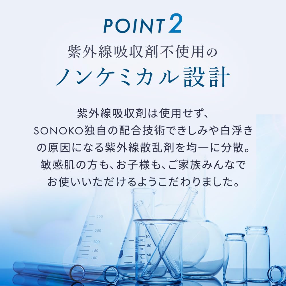 [Мощно блокирует УФ-лучи даже при болезненном солнечном свете! ] Ультрафиолетовые лучи вызывают множество проблем с кожей, таких как сухость и шероховатость кожи.. «Защитное средство от ультрафиолета» от SONOKO было разработано для надежной защиты вашей кожи. Несмотря на то, что это нехимическая разработка, подходящая для использования всей семьей, она имеет самую высокую степень защиты от ультрафиолета в Японии*2. Гладкая, эмульсионная текстура быстро распределяется по всем участкам кожи, плотно прилегая к ней и защищая ее от ультрафиолетовых лучей.