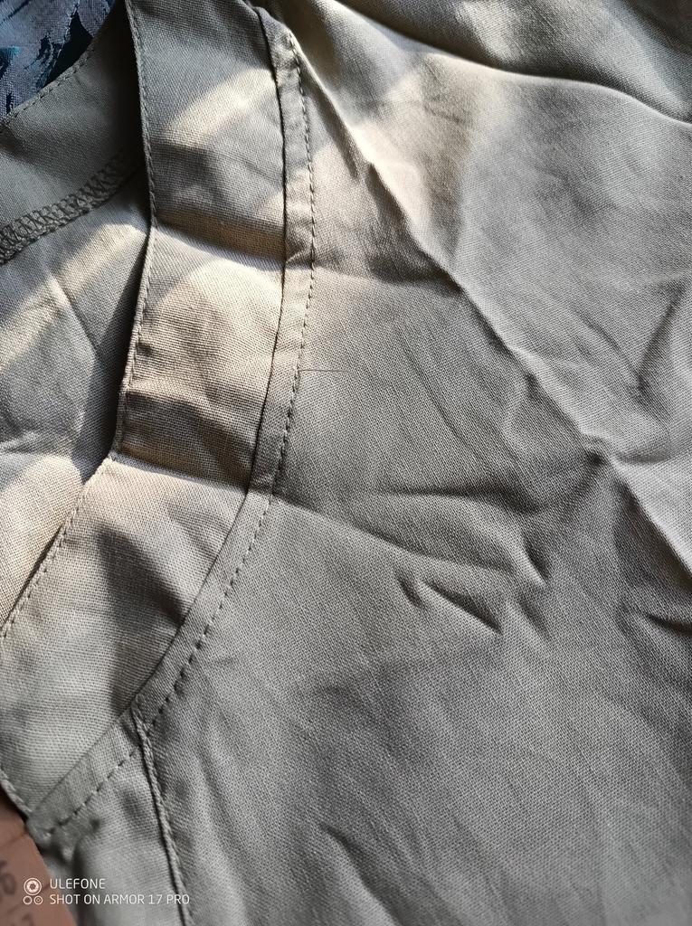 ткано вообще не соответствует фотографии. посто тонкая полупрозрачная хб. приятная, в жару дышит. НО. весь изюм этой модели именно в ткани. а без нее- просто обычная рубашка оверсайз. пуговицы дешманские, чтобы рукав красиво закатывался, нужно ее першивать, а там специально место под пуговицу оформлено- или возиться или оставлять так- минус еще 50% к образу. не рекомендую, за такие деньги точно