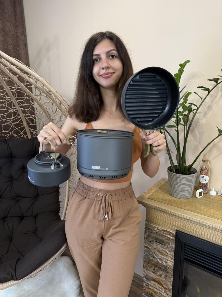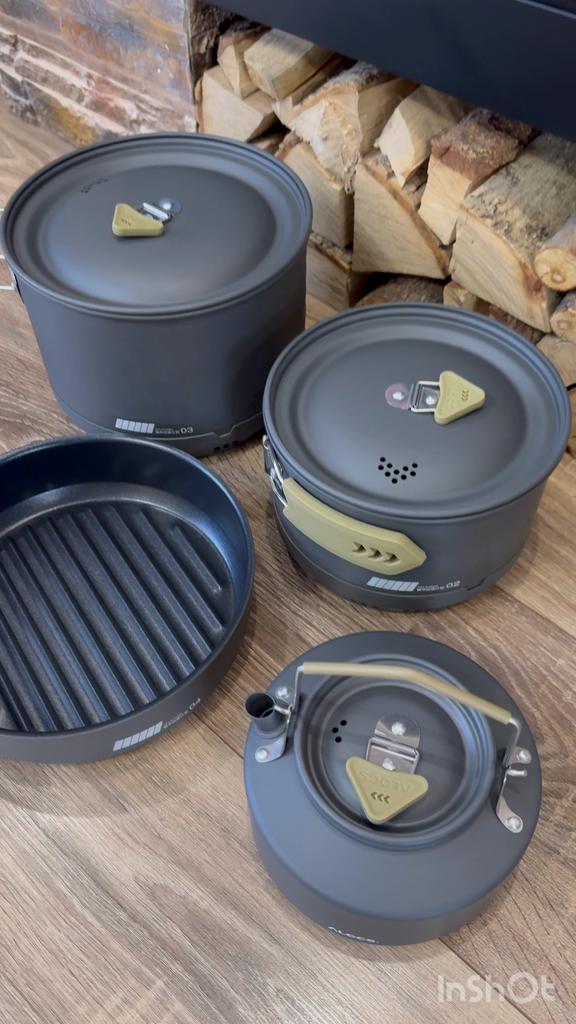 ❤️👍Набор для кемпинга с покрытием от бренда ALOCS Я приобрёл этот набор для кемпинга от ALOCS и могу с уверенностью сказать – это одно из самых удачных приобретений для туристической кухни. В комплект входит всё необходимое для приготовления пищи на открытом воздухе: две кастрюли с крышками, сковорода-гриль, чайник, все с ветрозащитными.✨ Вся посуда выполнена изготовлена из анодированного алюминия – это лёгкий, но прочный материал, устойчивый к коррозии и хорошо проводящий тепло. Внутреннее антипригарное покрытие действительно работает: еда не пригорает даже при минимальном количестве масла, а мытьё занимает считанные минуты.👍 Складные ручки с термостойкими накладками – очень удобное решение. Они не скользят, не греются и позволяют безопасно снимать посуду с огня. Также они надёжно фиксируются и не болтаются.😍 Чайник миниатюрный, но достаточно вместительный для двух-трёх человек. Вода закипает быстро, ручка фиксируется в нужном положении. Крышка не слетает, даже когда чайник полный.😊 Сковорода-гриль. Это просто находка! Поверхность рифлёная – отлично подходит для жарки овощей, мяса, сосисок. Продукты получаются с красивыми полосками, как на гриле. Покрытие легко чистится даже после жирной еды. Кастрюли разного объёма, компактно вставляются одна в другую. Крышки с удобными треугольными ручками – легко снимать даже в перчатках. Подходят как для готовки на газовых горелках, так и на открытом огне (но желательно не ставить прямо в пламя – для долговечности покрытия). Ветрозащита - очень важный элемент в условиях похода – позволяет экономить газ и быстрее готовить при ветре. Вся посуда компактно укладывается друг в друга, занимает минимум места в рюкзаке. Весь набор упаковываю в специальный мешок, он прилагался. Это действительно качественный и функциональный набор посуды для походов, кемпинга, пикников и даже длительных путешествий. Он лёгкий, прочный, безопасный в использовании и занимает очень мало места. Бренд ALOCS приятно удивил – отличное соотношение цены и качества. Смело рекомендую как новичкам, так и опытным туристам!🌸