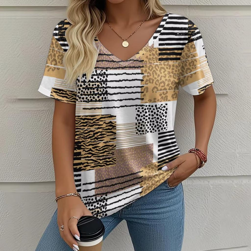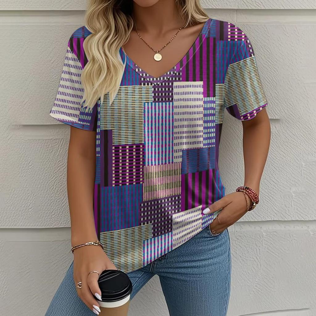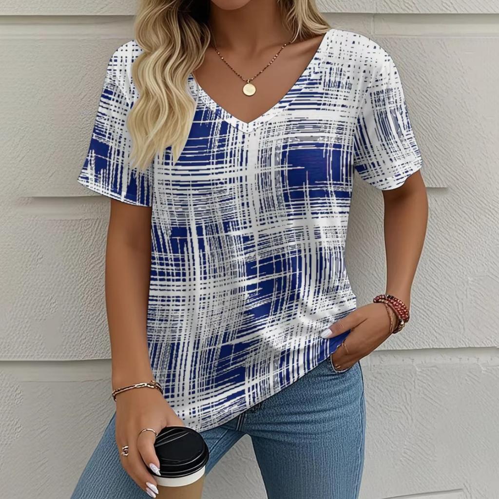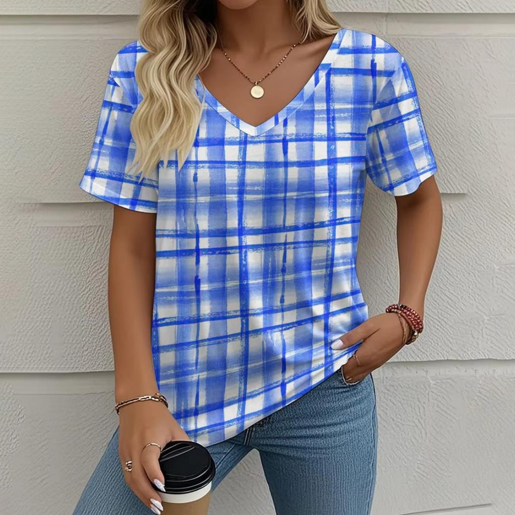 Летняя ретро женская футболка с коротким рукавом, модная повседневная клетчатая принтованная одежда, топы с V-образным вырезом, размер женской одежды