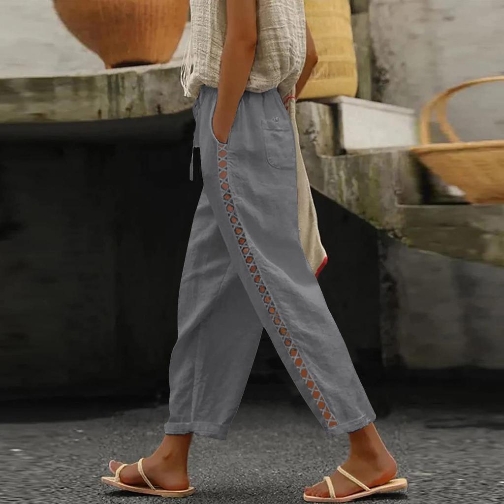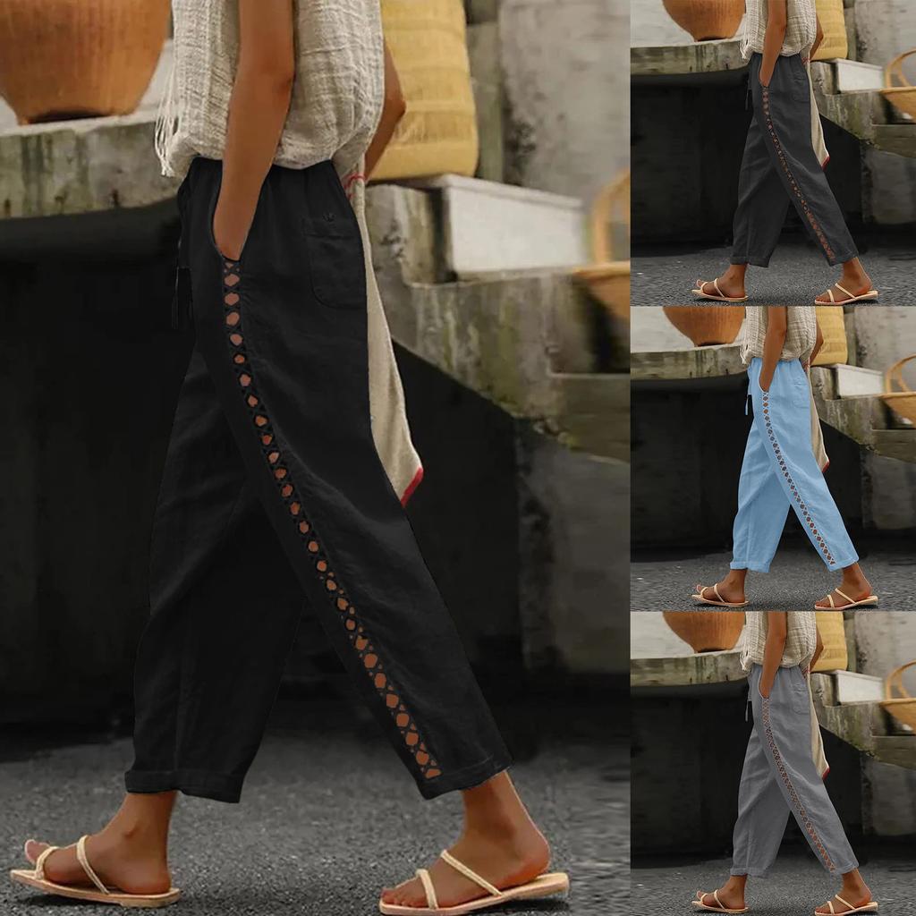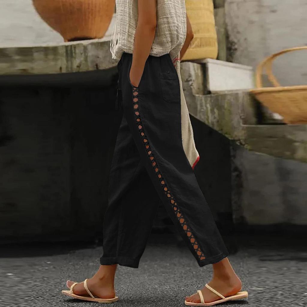 Женские модные мешковатые брюки с карманами, тонкие дышащие кружевные края, полые однотонные повседневные брюки в стиле ретро
