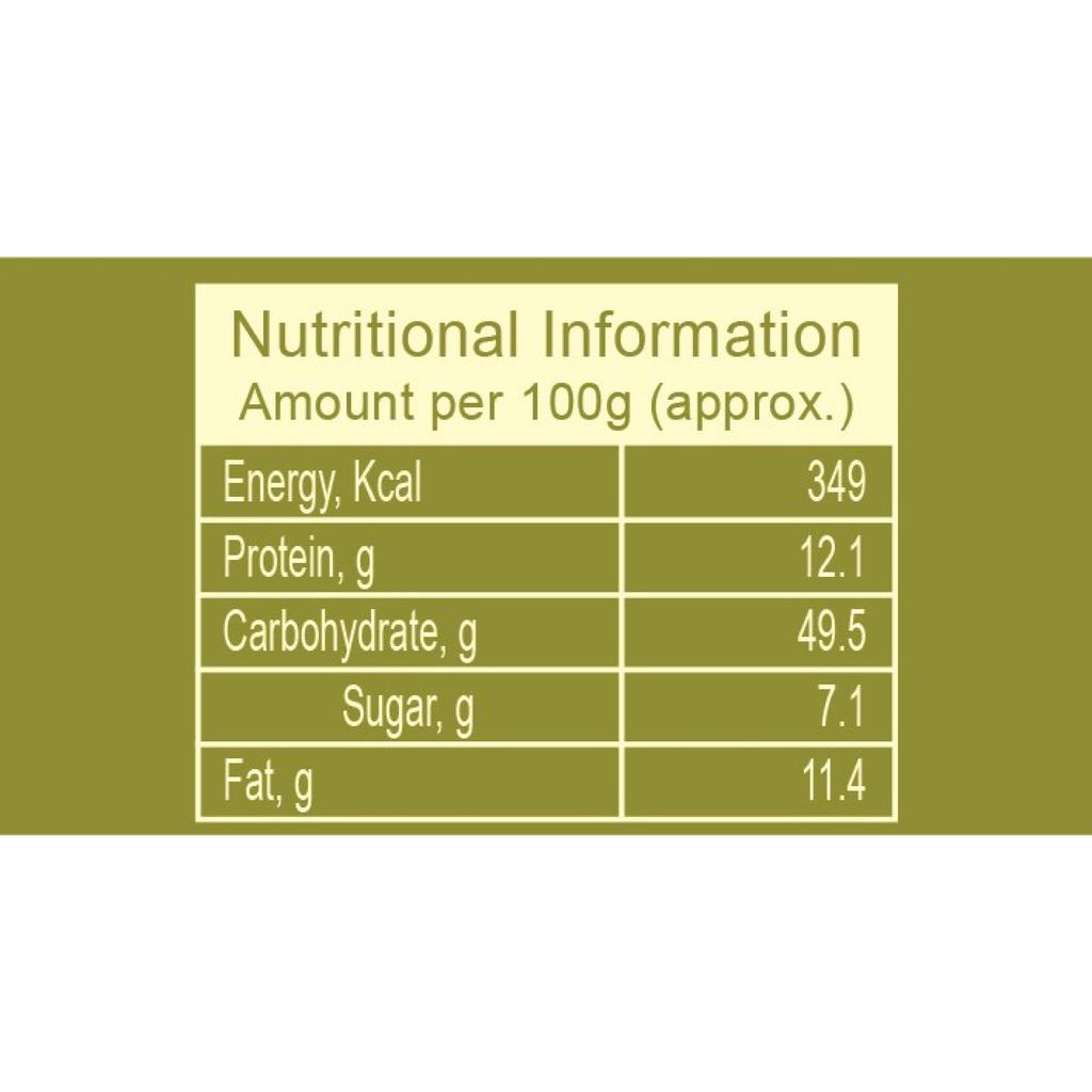Энергетическая ценность (энергии) – 349 ккал, Белки (белок) – 12,1 г углеводов (Углеводов) — 49,5 г сахара (сахар) – 7,1 г, Жир (Жир) - 11,4 г.
