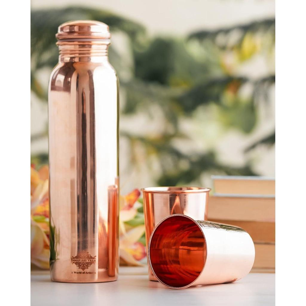 Подарочный набор посуды для питья из чистой меди с гладкой отделкой, 1 бутылка и 2 стакана с подарочной коробкой, бутылка - 900 мл и стакан - 275 мл