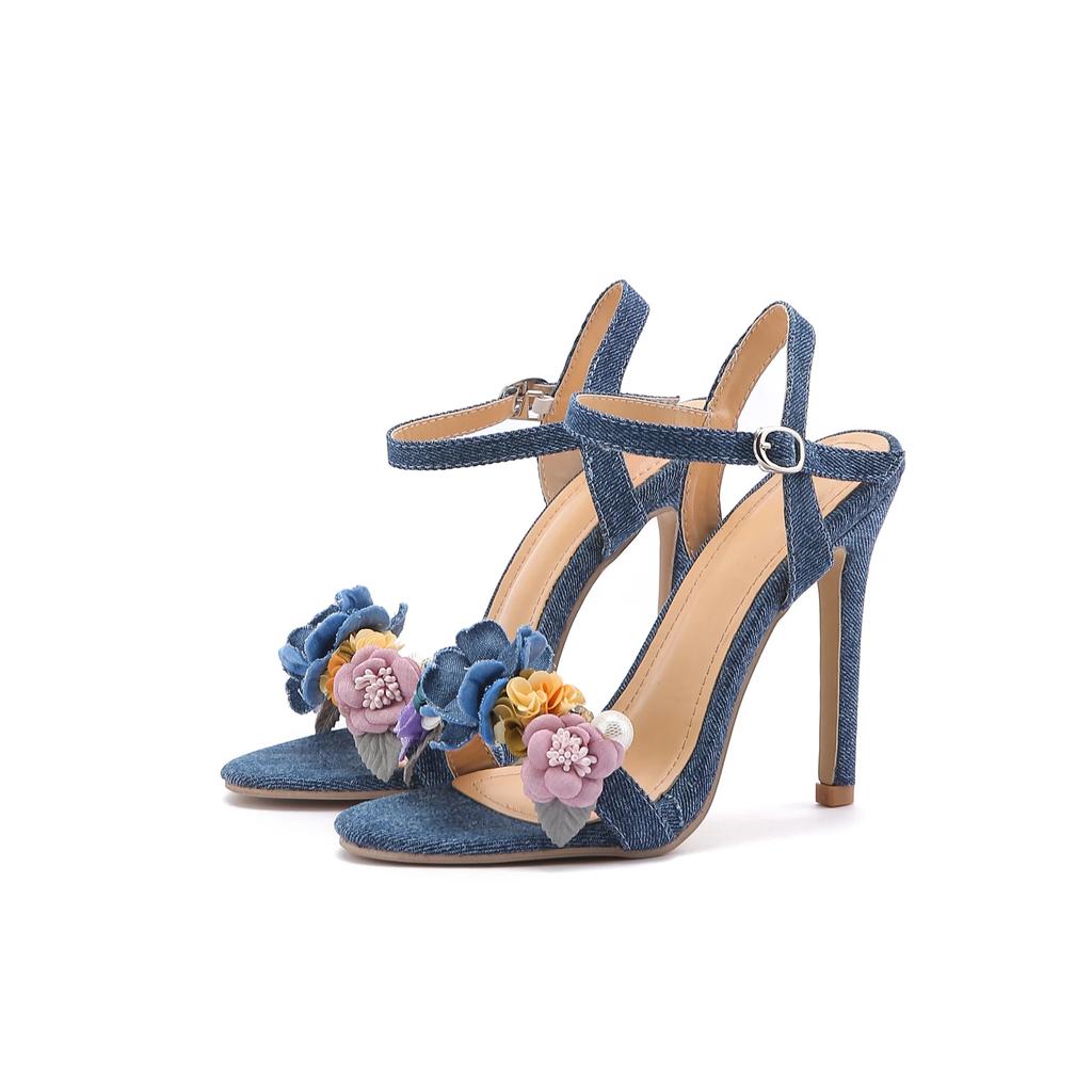 Летняя мода женские сексуальные жемчужные цветочные джинсовые пряжки синие босоножки на высоком каблуке туфли для вечеринки