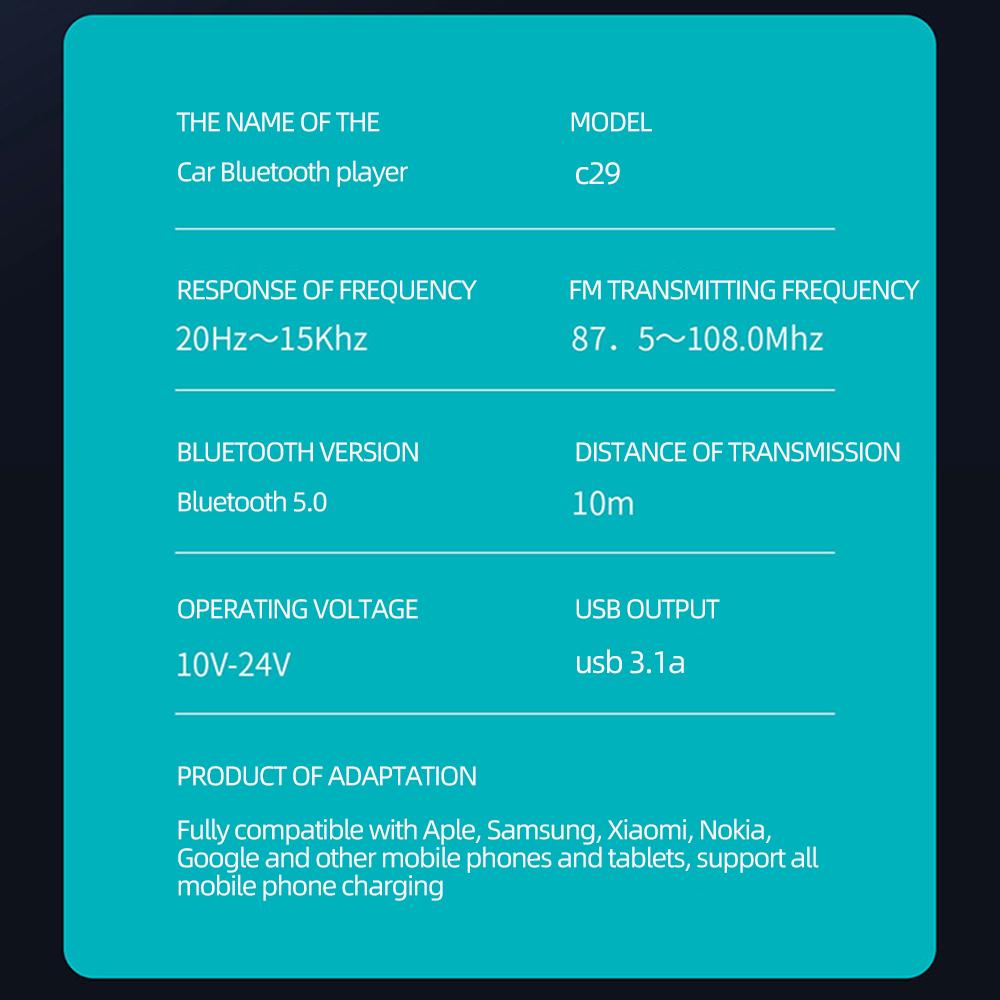 5. Bluetooth 5.0 и Широкая Совместимость: Особенности: передовой Bluetooth v5.0 для более быстрой передачи, более быстрого сопряжения и стабильных соединений. Совместим с большинством смартфонов и устройств с функцией Bluetooth. Регулируемый диапазон частот от 87,5 МГц до 108 МГц.