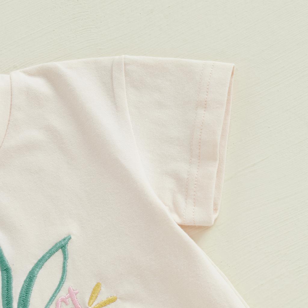 Наряд для девочки на Пасху; Летний комбинезон для девочки с милой вышивкой в виде кролика добавит нотку причудливости в гардероб вашего малыша.; Короткие рукава, круглый вырез и застежка на кнопки в шаговом шве — простые, но стильные решения, которые сделают вашего малыша еще очаровательнее.