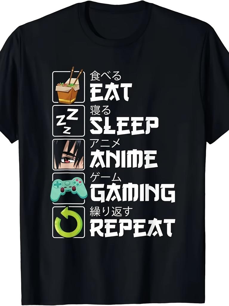 Мужская футболка с принтом «Eat, Sleep, Anime, Repeat» — короткий рукав, круглый вырез, черный цвет с красочными значками — повседневная летняя одежда