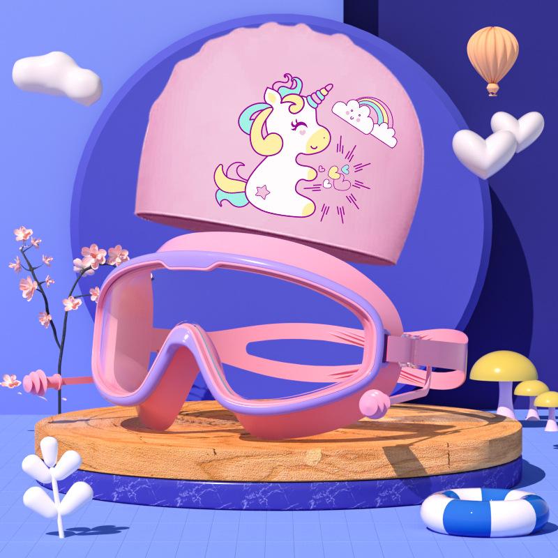 Комплект из очков и шапочек для плавания, детские очки с большой оправой, водонепроницаемые, противотуманные, для мальчиков и девочек, плавательные очки с рисунком, шапочка для купания