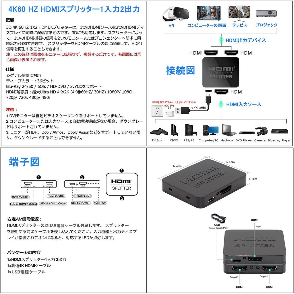 [Комплектация/Гарантия качества] Разветвитель HDMI имеет размер ладони и устойчивую плоскую конструкцию, что позволяет использовать два дисплея, не занимая много места.. Содержимое пакета: Корпус разветвителя HDMI x 1, кабель HDMI2.0 1,5 м x 1, кабель питания USB x 1, руководство пользователя на японском языке x 1. Поставляется с 12-месячной японской гарантией, поэтому, если у вас возникнут какие-либо вопросы или возникнут проблемы с продуктом, обратитесь в службу поддержки клиентов, и мы заменим продукт или вернем вам деньги.. Пожалуйста, не стесняйтесь обращаться к нам в любое время. Мы всегда делаем все возможное для предоставления гарантийного обслуживания.