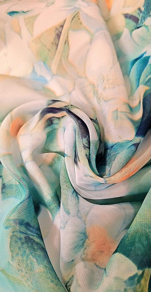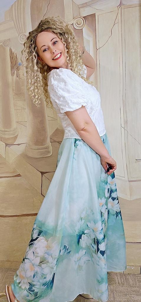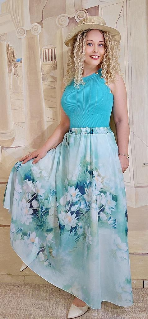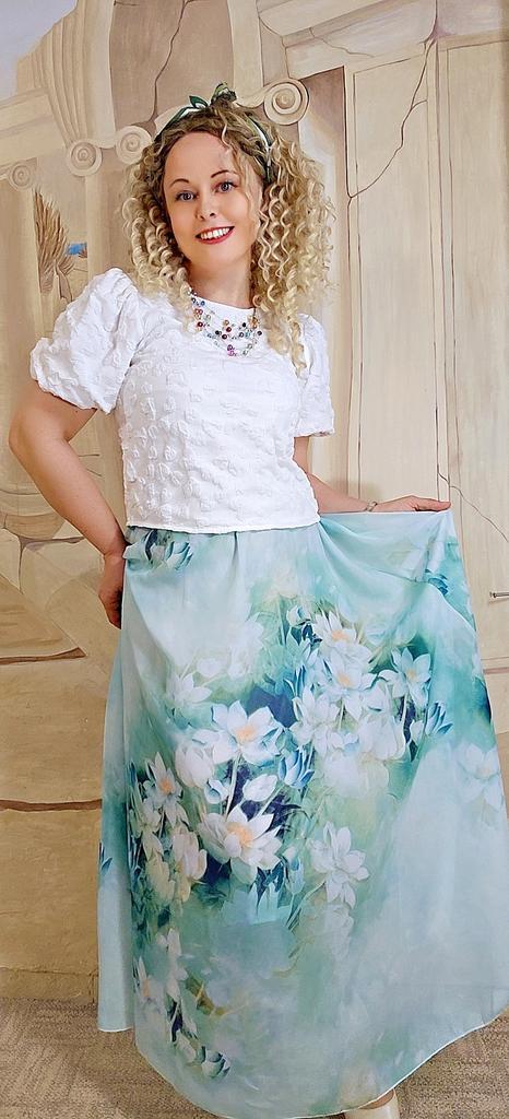 Волшебная юбочка 🌸☘️ Невероятно нежная и очень красивая)) Красивый цвет и рисунок, цветы сказочные)) Ткань воздушная, похожа на шифоновую, лёгкая. Юбочка на подкладе белого цвета, подклада отлично тянется. Пояс на широкой резинке, резинка внутри ткани. Ткани много, смотрится достойно. Впереди без шва, полное полотно, сзади посередине тоже без шва. По замерам: ОТ 65 в спокойном состоянии, тянется до 80- 85 см хорошо. В ОБ широкая, так как присобрана и расширяется к низу. Длина 90см. На рост 158 макси)) Мне очень понравилась, расцветка чудесная☺️🌸🧡 От души рекомендую⚘️
