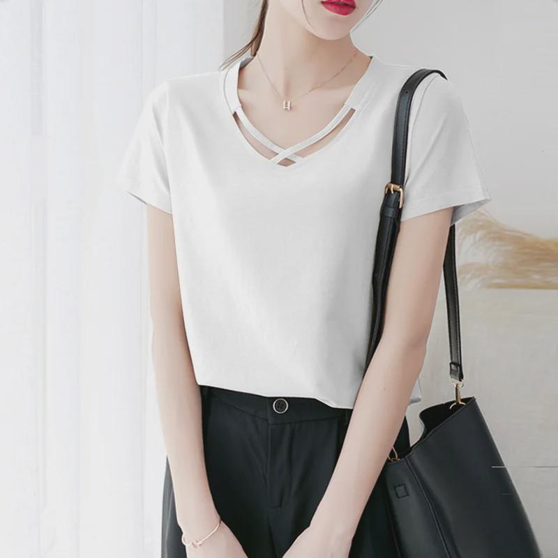 Женский летний топ 2024 года с V-образным вырезом, короткими рукавами, в корейском стиле, с перекрестным вырезом, однотонный — купить товар онлайн с бесплатной доставкой по всему миру!