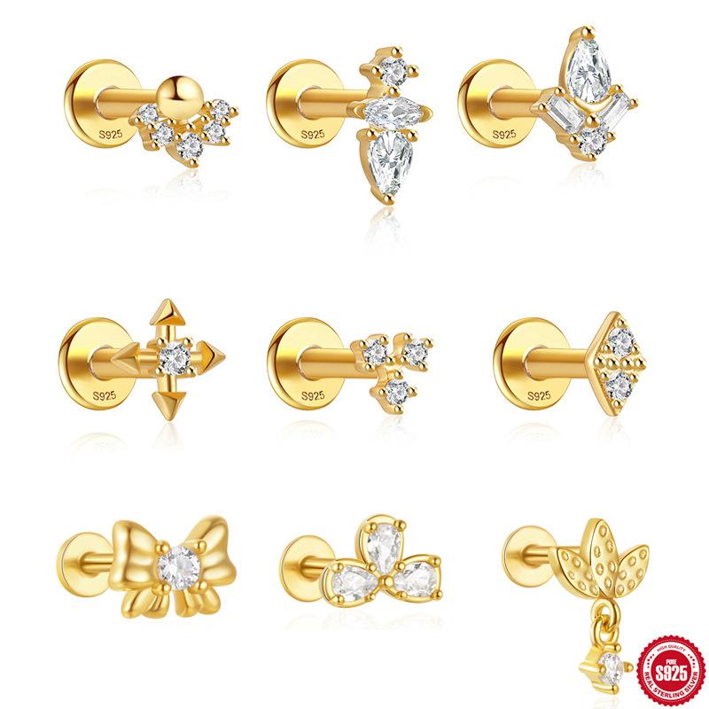 Серьги-пусеты из стерлингового серебра S925, Ins-ветер, геометрия, драгоценный камень, модный пирсинг, внутренняя резьба, плоское дно, 16G, для козелка уха