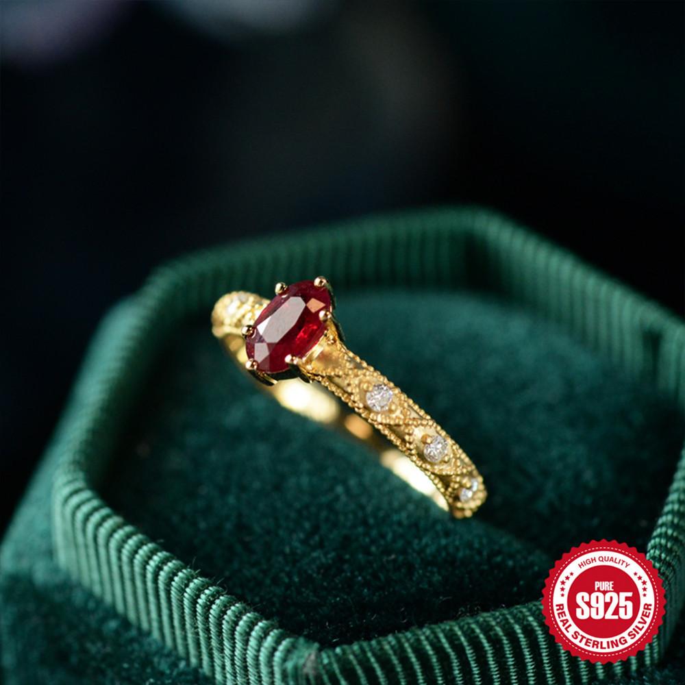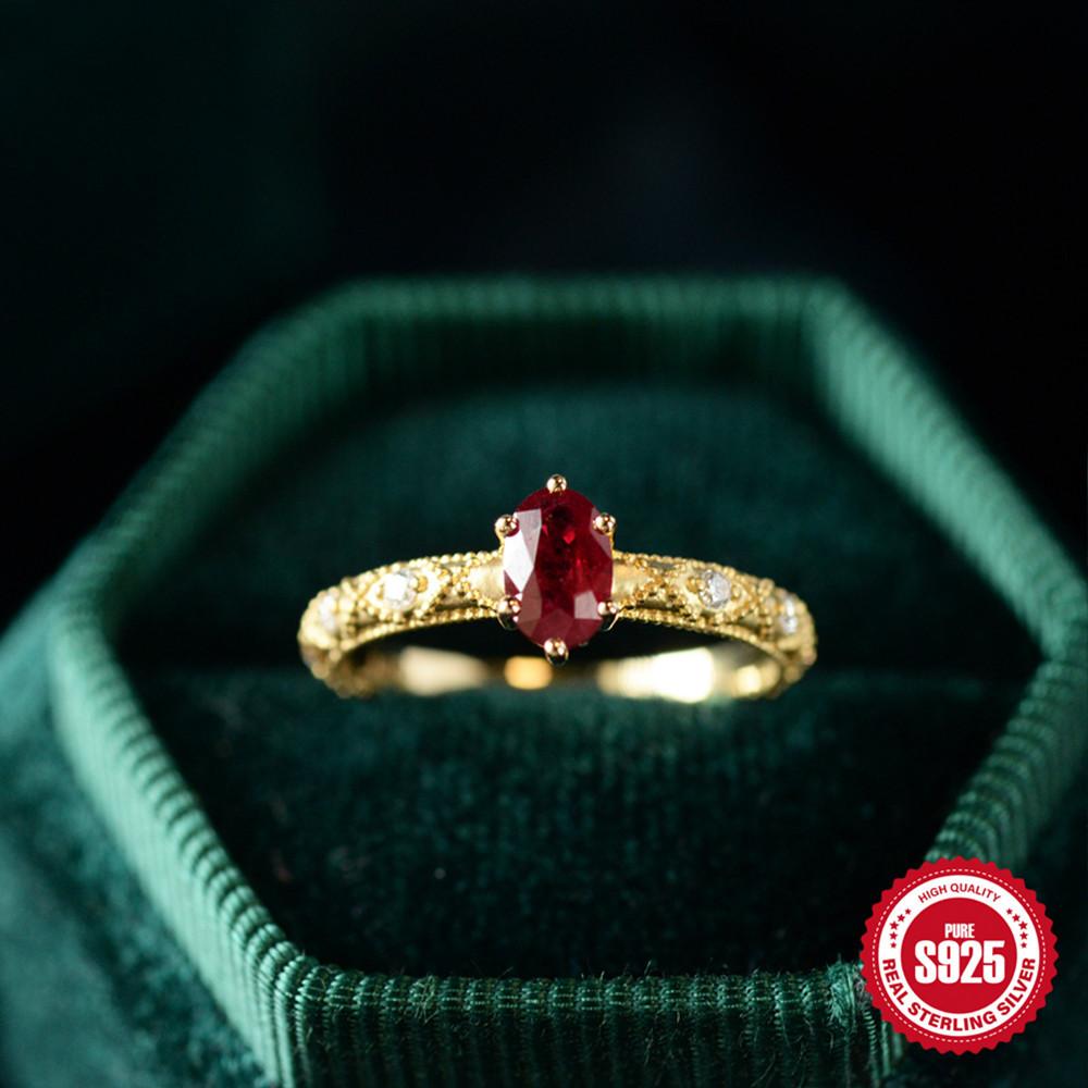 S925 Элегантное ретро-стиль суда Простое натуральное рубиновое светло-роскошное позолоченное открывающееся кольцо в форме яйца, регулируемое