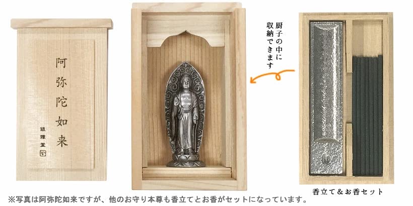 Серии: Шугохондзон (старый красивый серебристый цвет) с Дзуси, включает в себя статую Будды, Дзуси, коробочку для благовоний (Внутренняя коробка для дзуси), подставка для благовоний и палочки для благовоний (Shoeido — магазин благовоний с многолетней историей).