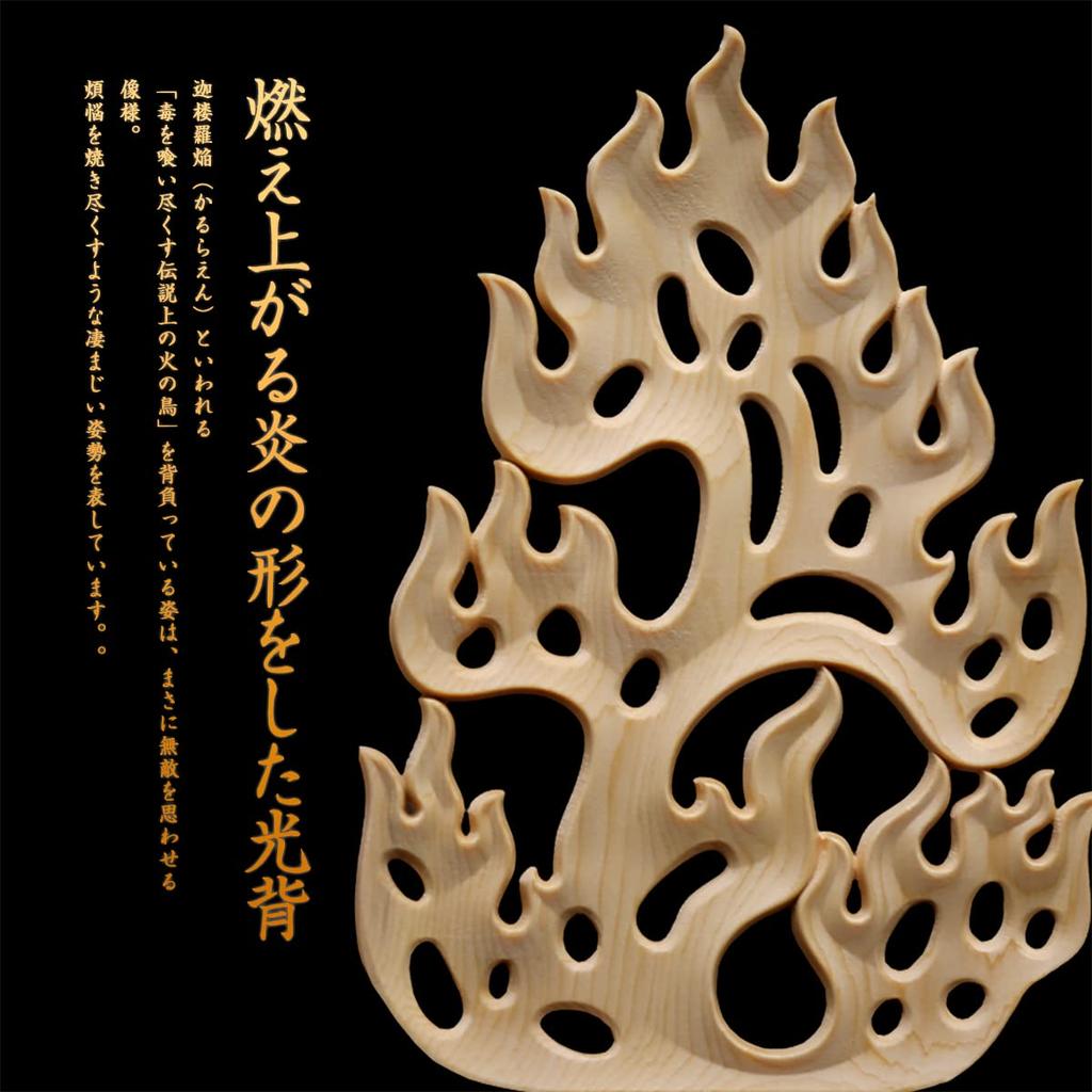 △ Нимб в форме пылающего пламени, называемый Карураен. Фигура, несущая на спине «легендарную жар-птицу, пожирающую яд», — статуя, которая заставляет вас думать о непобедимости.. Это ужасная позиция, которая сжигает мирские желания.