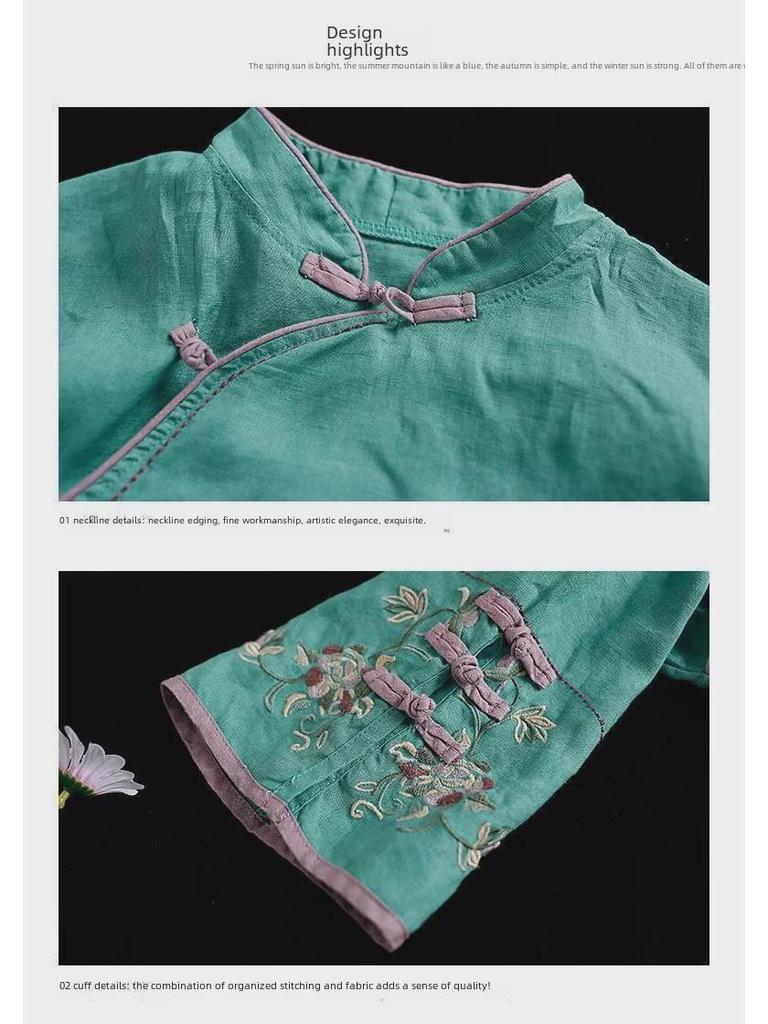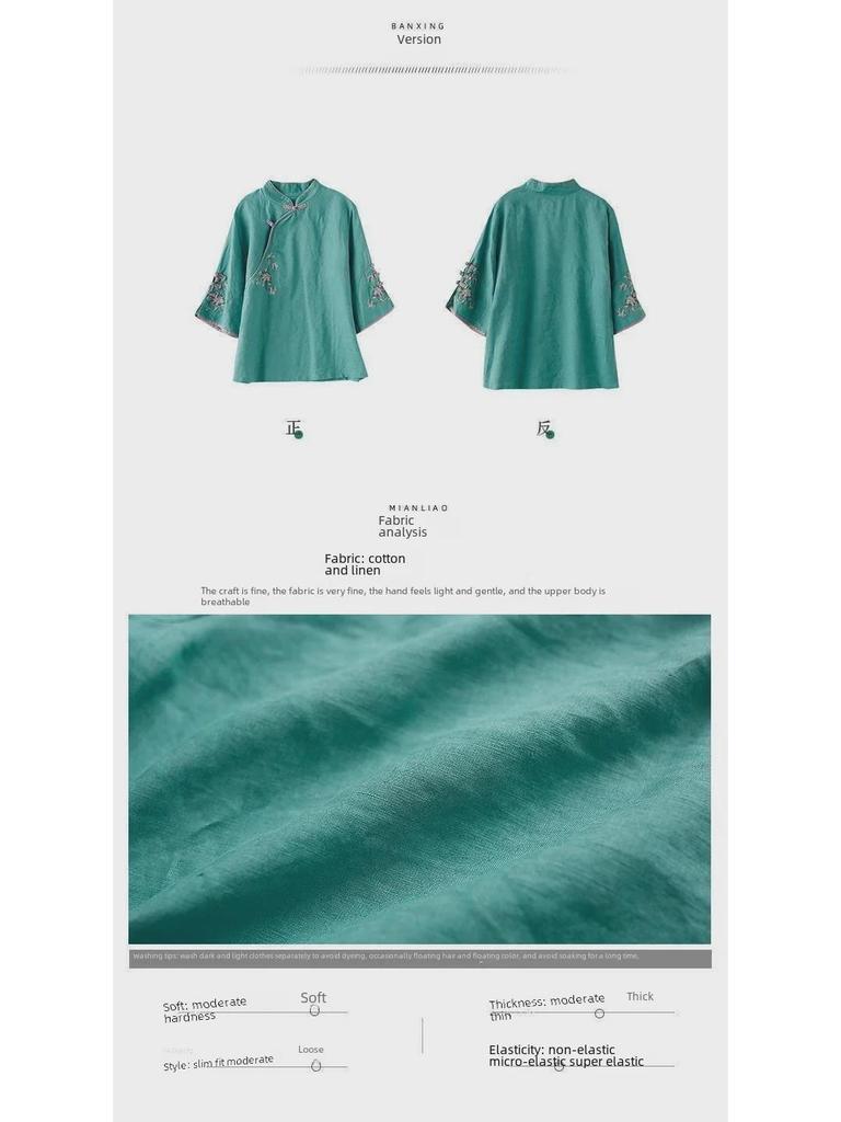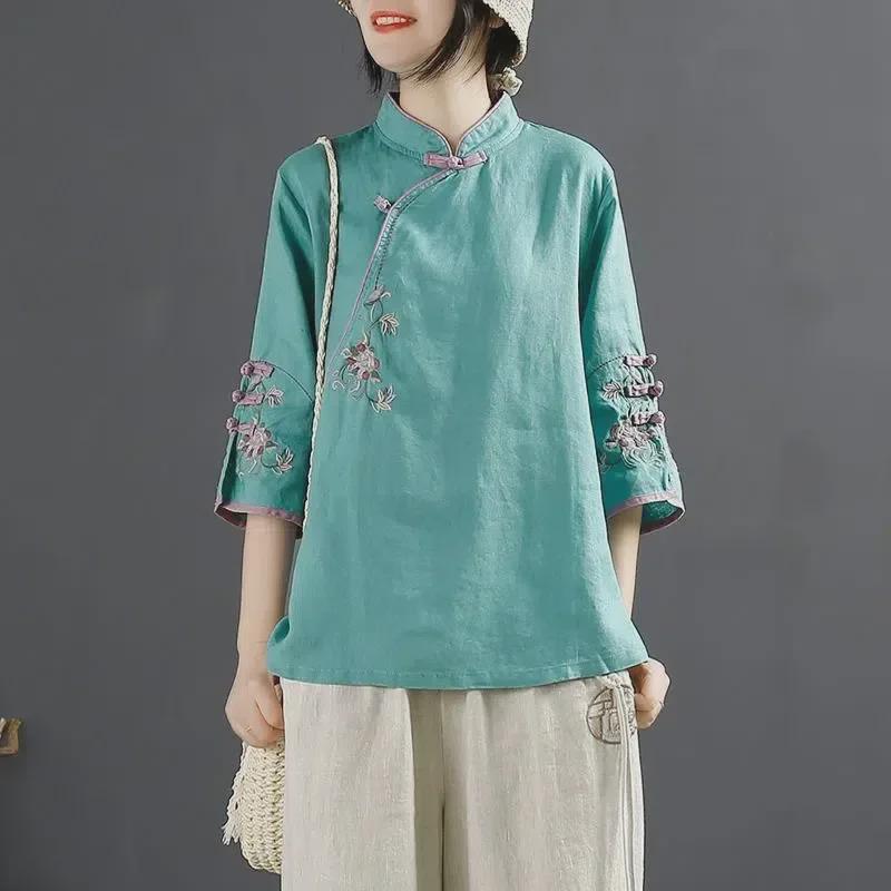 2024 Ретро китайская рубашка из хлопка и льна: Женский топ весна/лето с воротником-стойкой, застежкой на пуговицы и вышитыми косыми лацканами