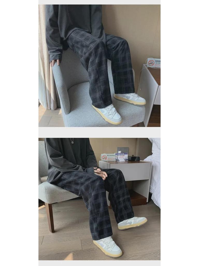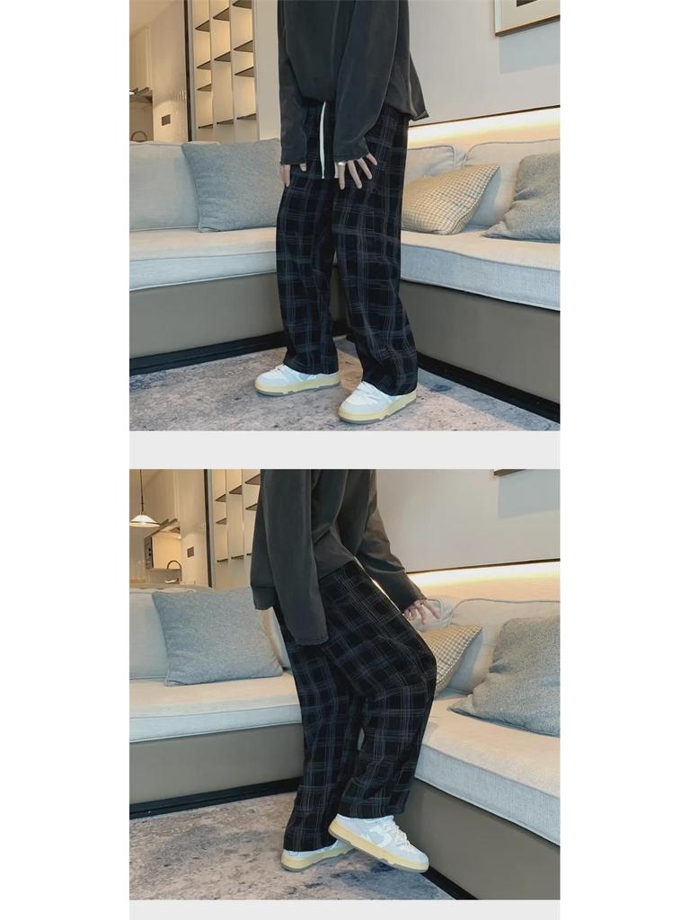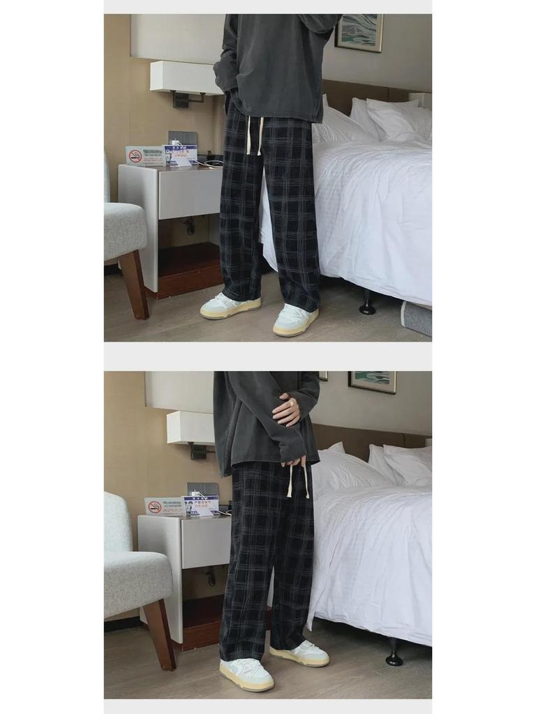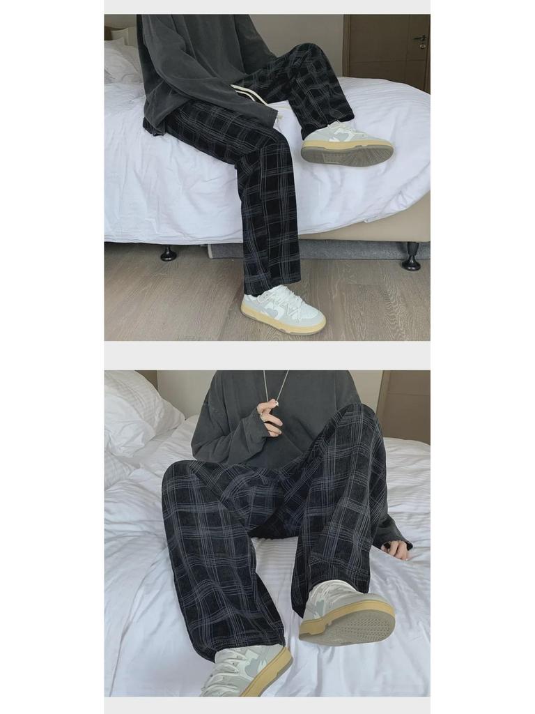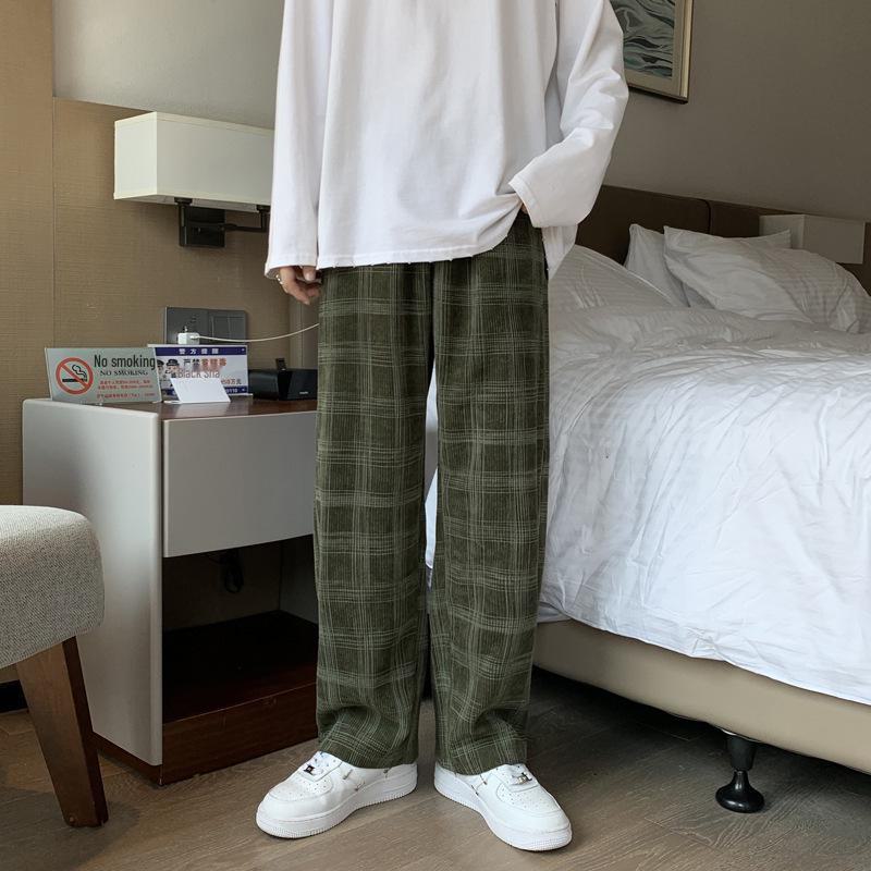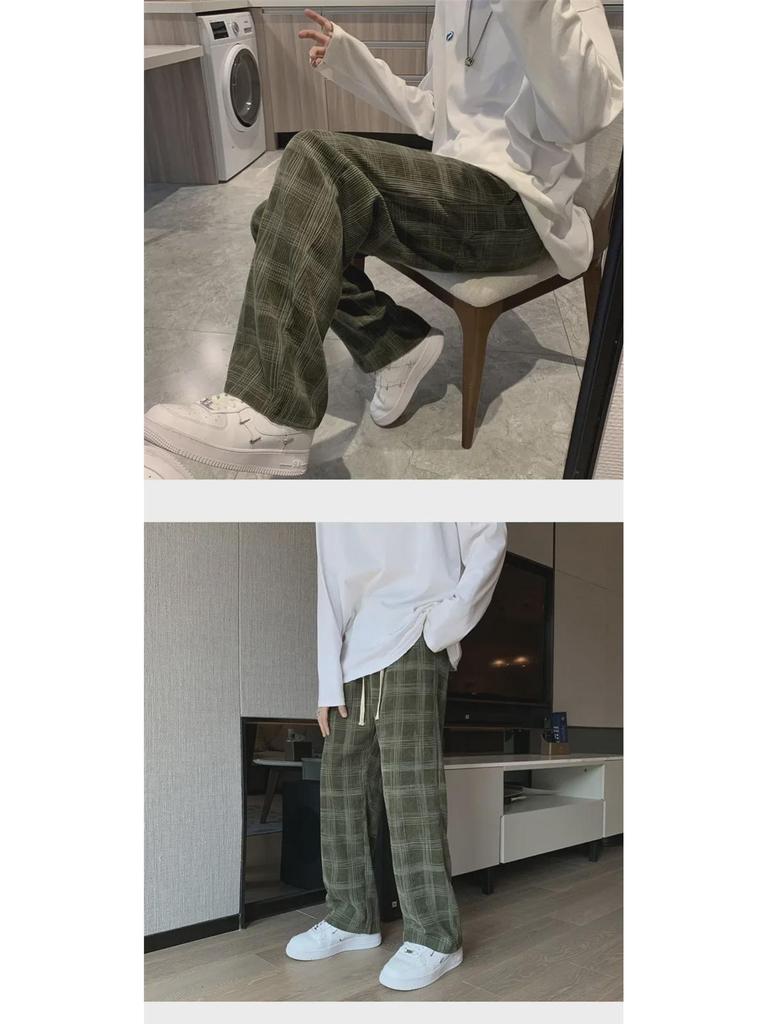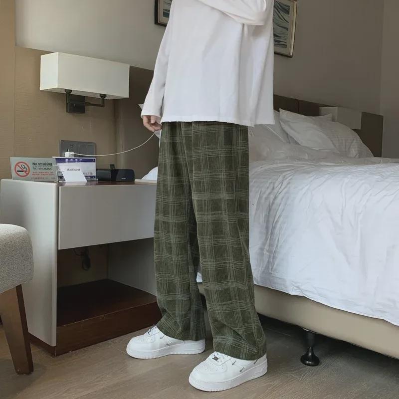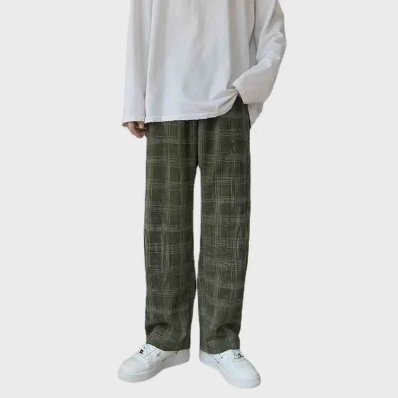 Мужские вельветовые клетчатые повседневные брюки с широкими штанинами - стиль Гонконга, модные, свободные, прямые брюки
