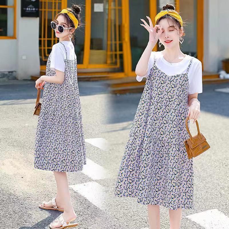 Платье-футболка для беременных весна/лето 2024 года с цветочным принтом — свободное, большого размера, имитация двух частей