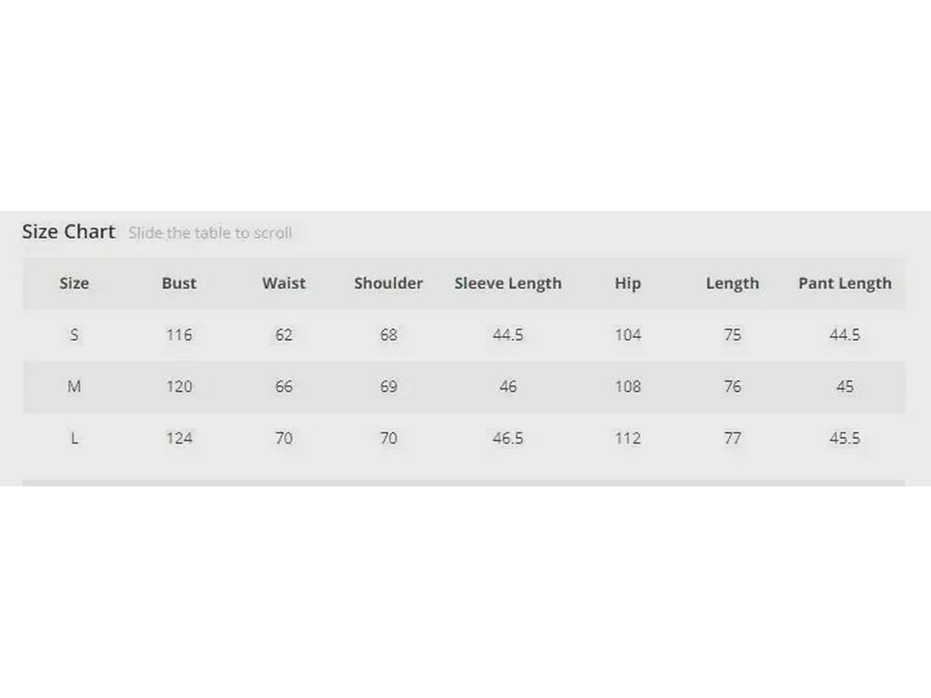 размер: L, бюст: 124 см, талия: 70 см, плечо: 70см, Длина рукава: 46.5cm, Бедро: 112 см, длина: 77см, Длина брюк: 45.5см.